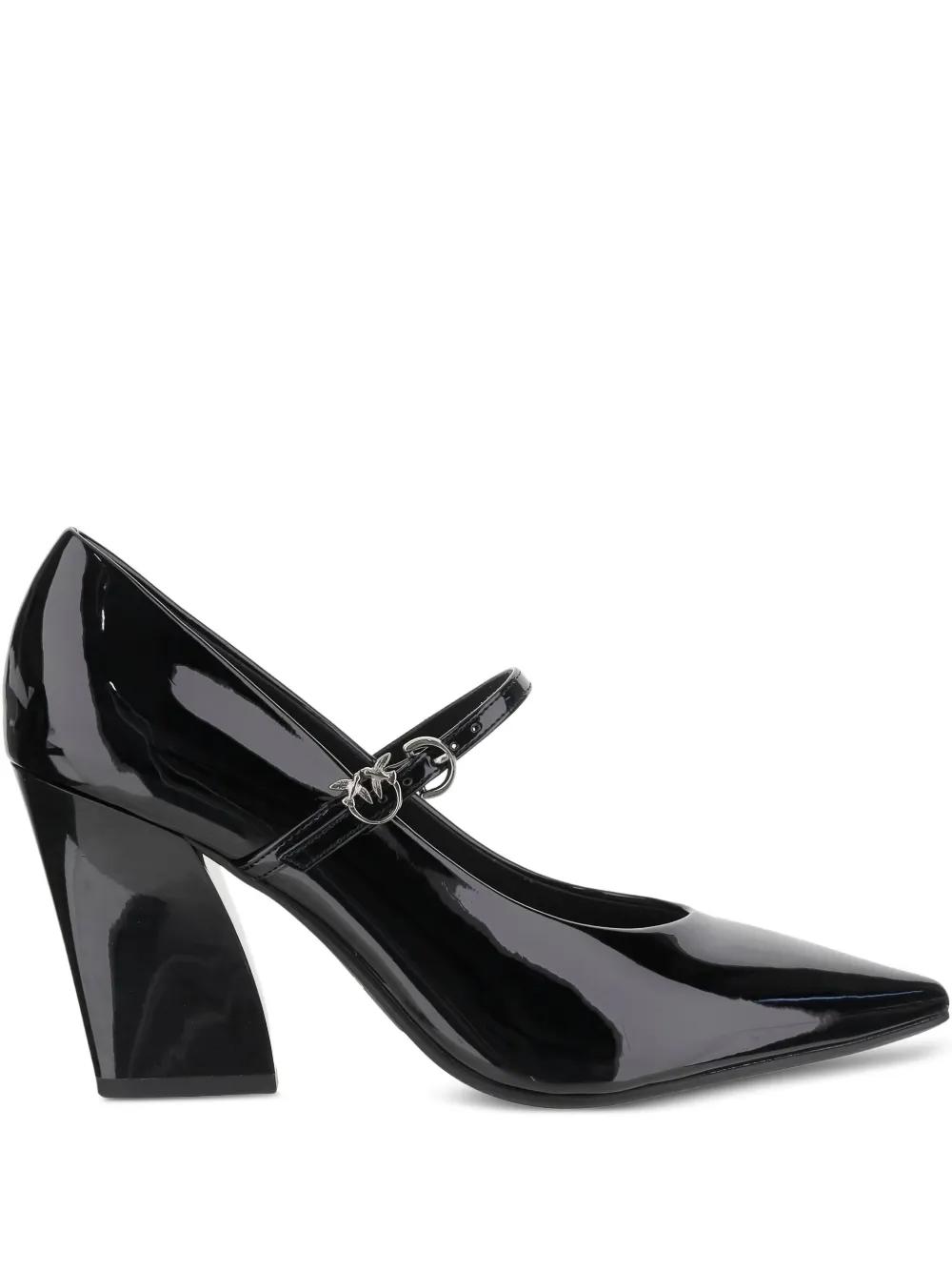 black glossy leather pointed toe adjustable ankle strap metal buckle block heel