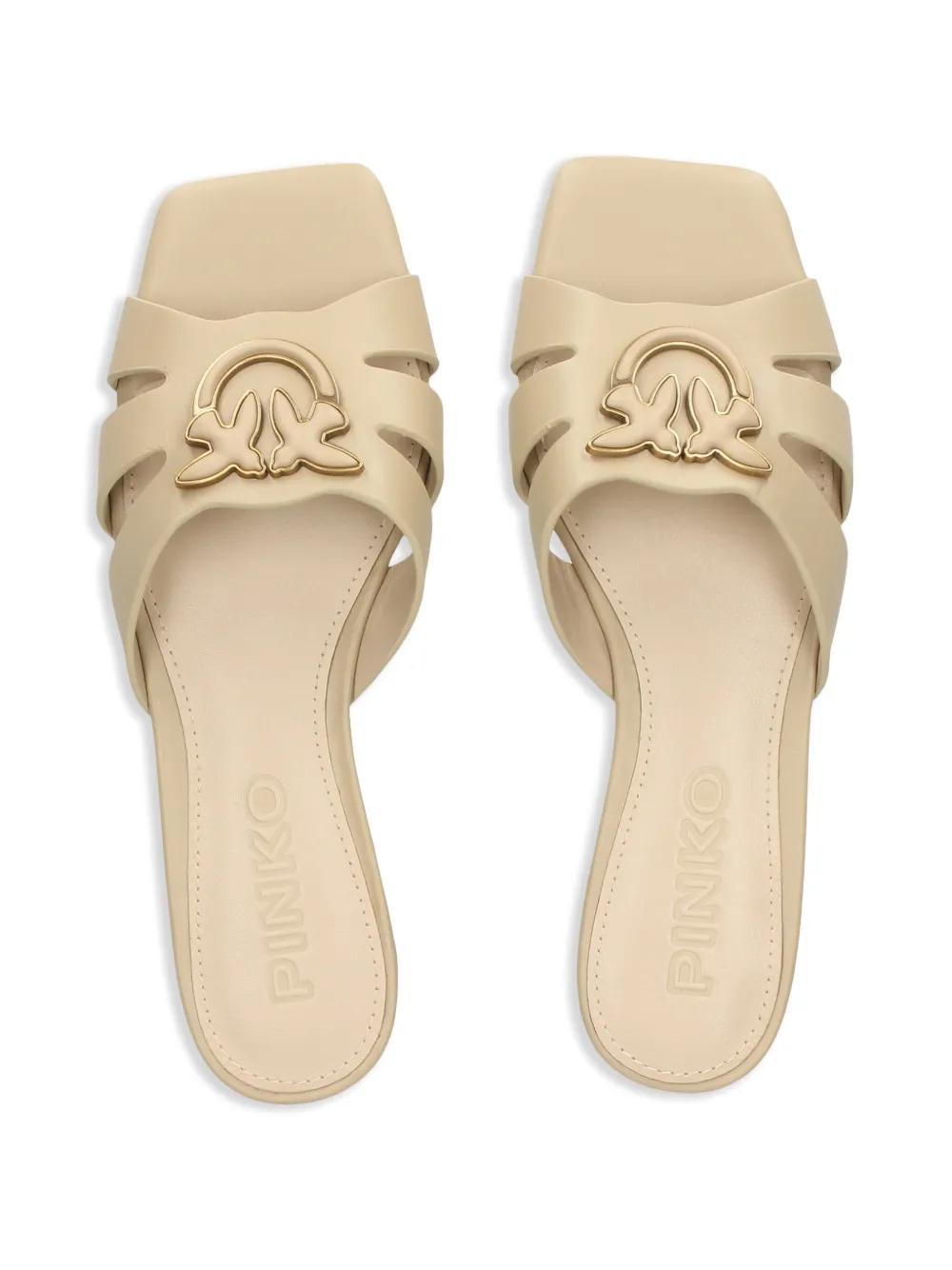 sand beige slip-on style signature Love Birds buckle square open toe branded leather insole