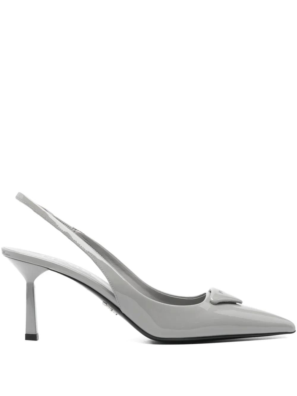 grey patent leather slingback strap pointed toe triangular logo detail stiletto heel