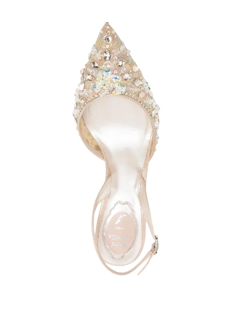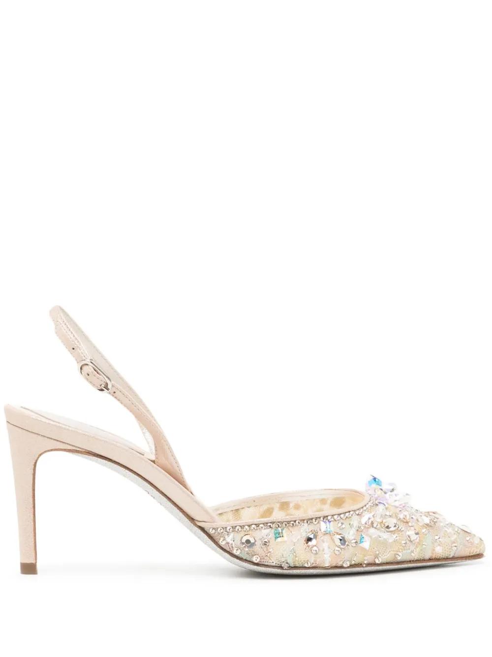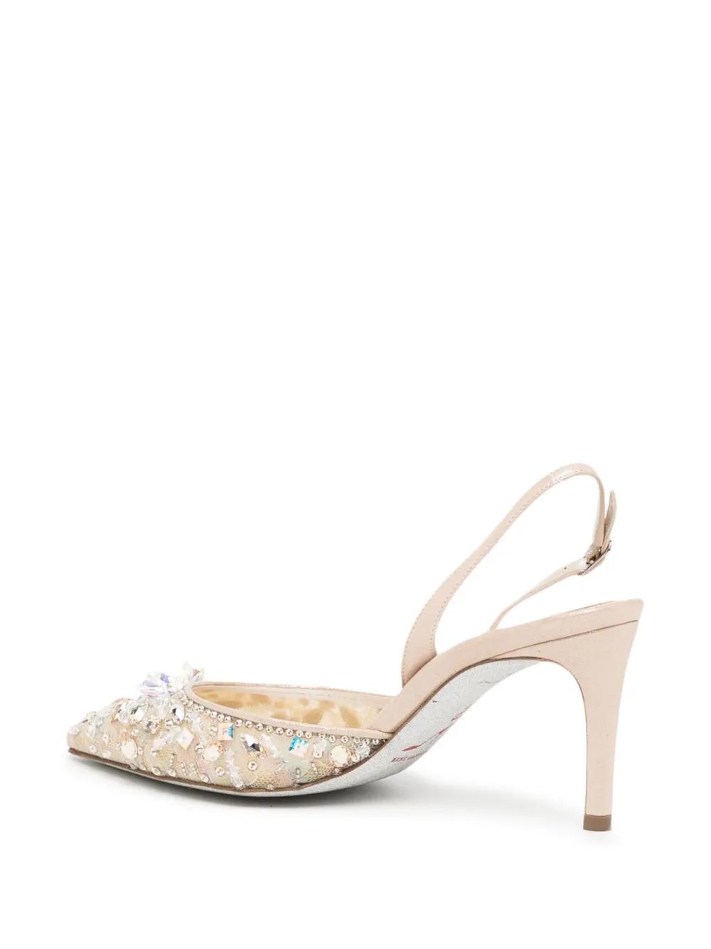 beige/multicolour calf leather mesh detailing crystal embellishment rhinestone embellishment branded insole branded insole pointed toe buckle-fastening slingback strap 70mm mid heel