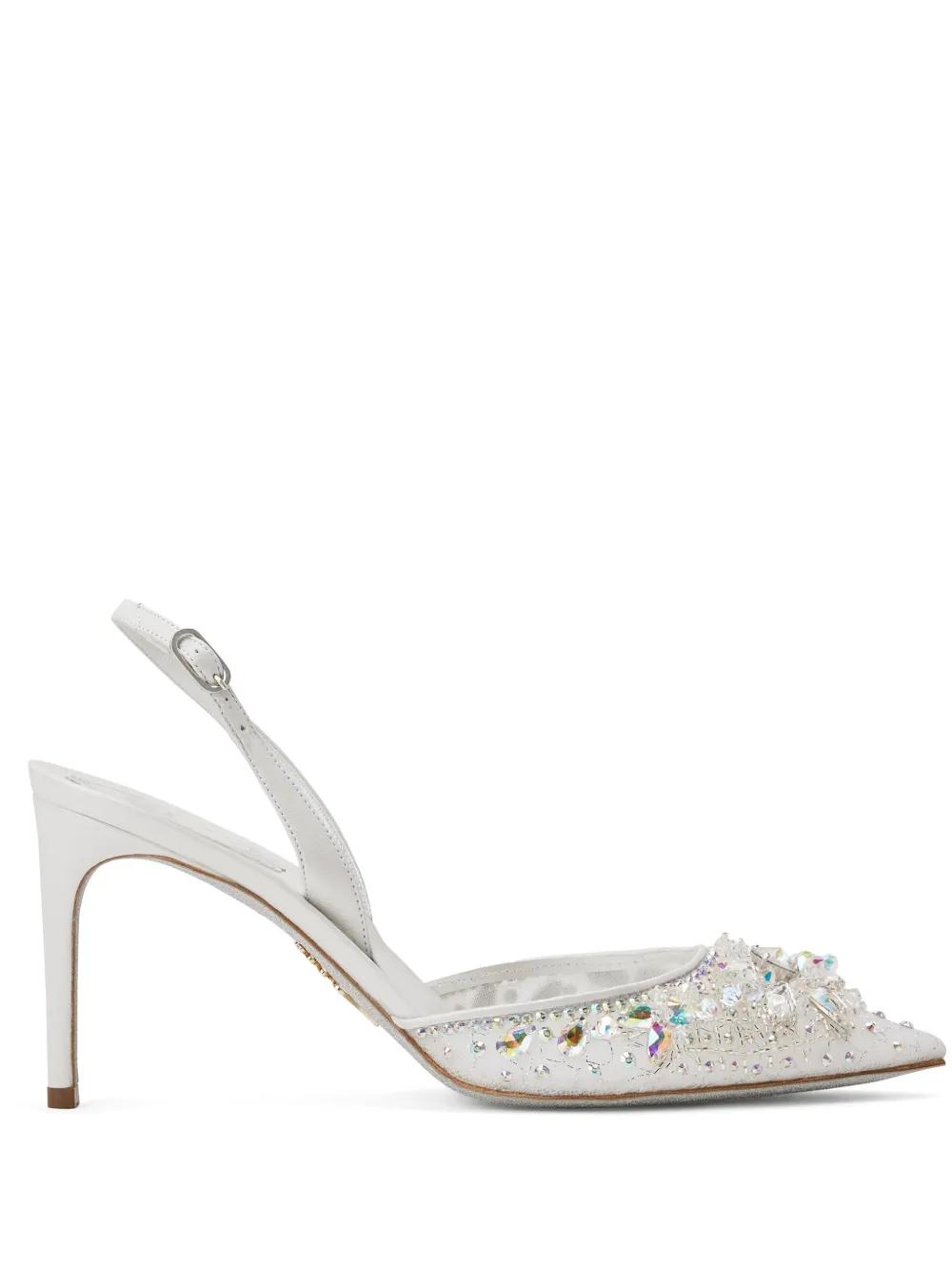 white calf leather crystal embellishment pointed toe buckle-fastening slingback strap branded insole high 80mm stiletto heel