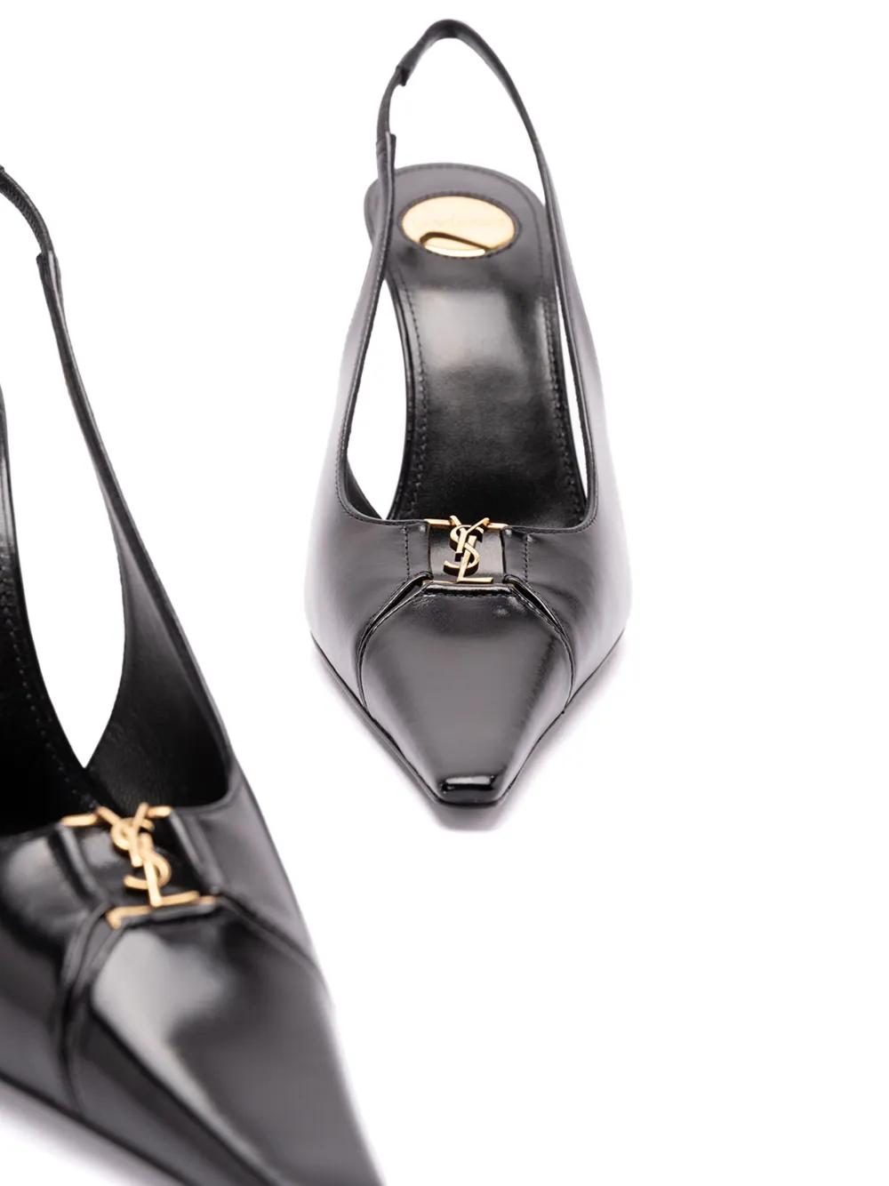 black leather upper pointed toe slingback strap gold-tone Cassandre logo stiletto heel