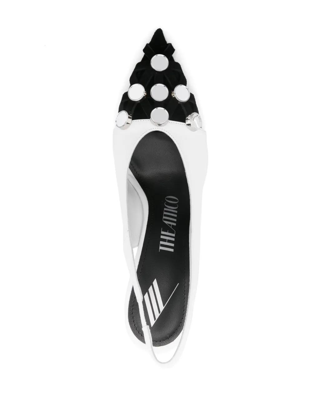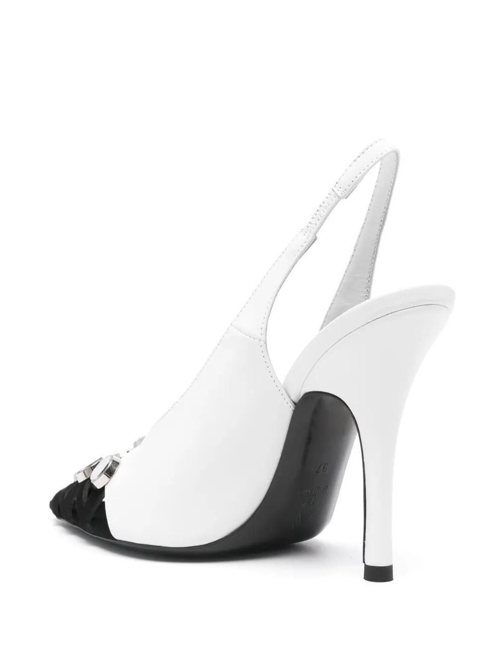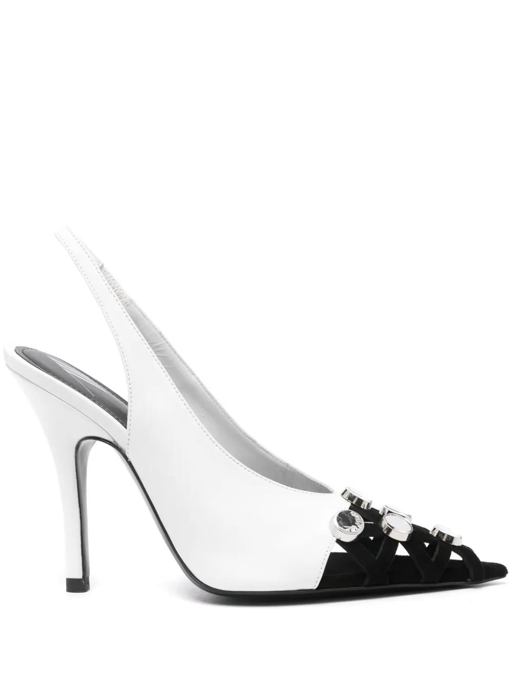 white/black calf leather/calf suede colour-block panelled design pointed toe cut-out detailing mirror appliqué detailing elasticated slingback strap branded footbed leather lining 105mm high sculpted heel leather sole silver-tone hardware slip-on style This piece comes complete with a protective dust bag.