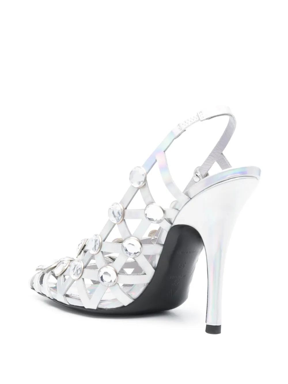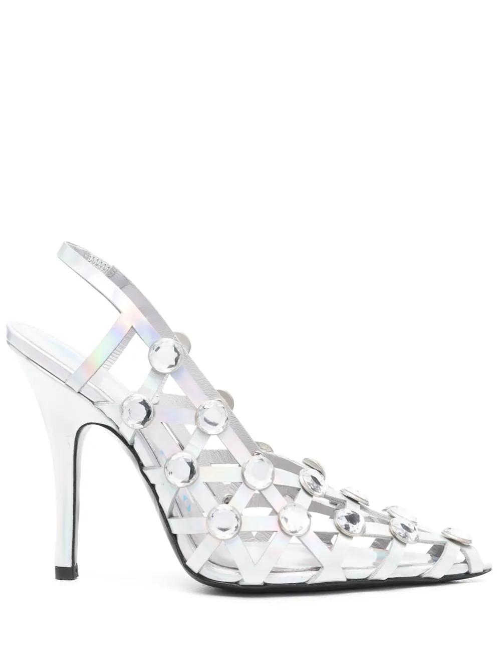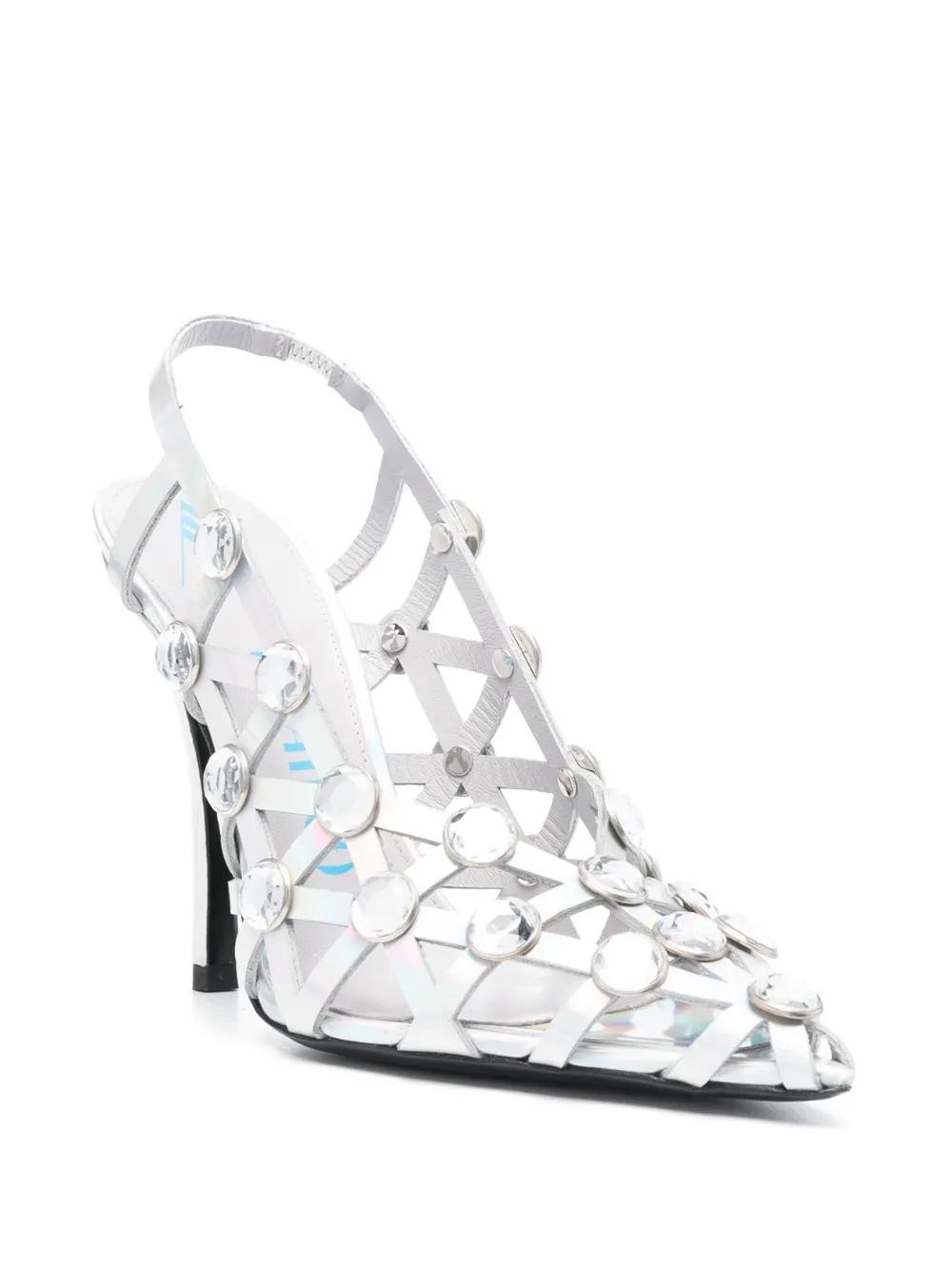 silver-tone calf leather holographic effect crystal embellishment caged design elasticated slingback strap pointed toe branded footbed 105mm stiletto heel