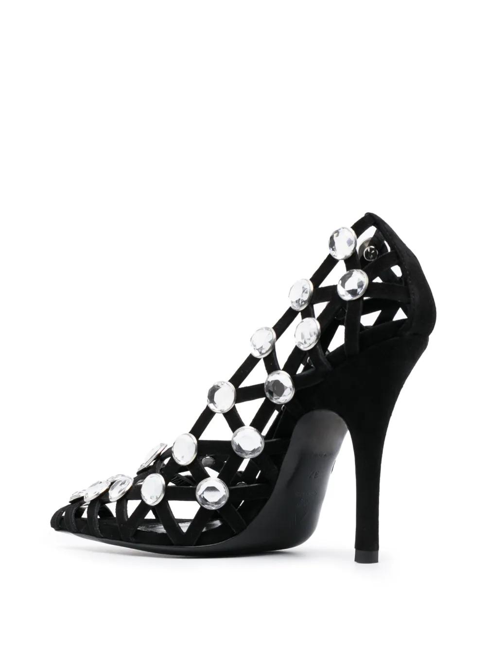 black calf leather cut-out detailing rhinestone embellishment pointed toe slip-on style branded insole high stiletto heel