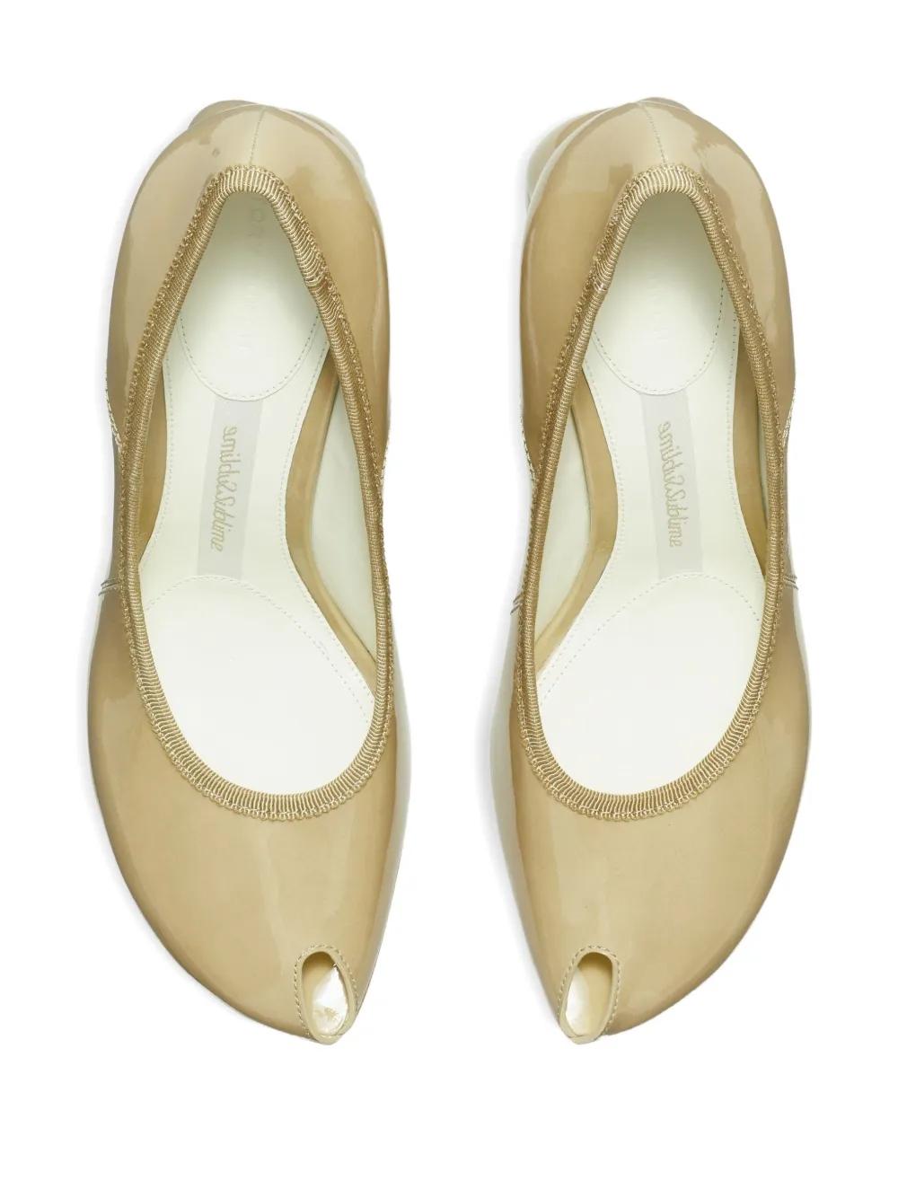 beige patent leather peep toe 90mm heel sculpted heel elasticated topline