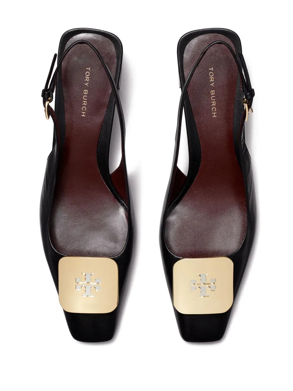 black nappa leather signature Double T motif gold-tone hardware square toe buckle-fastening slingback strap branded insole mid block heel