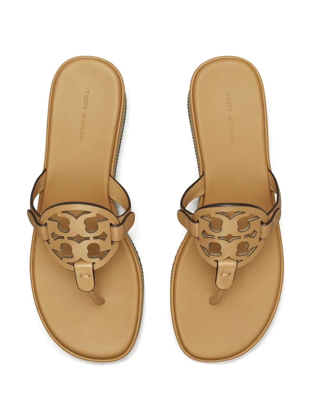 sand beige leather smooth grain signature Double T motif stud detail round open toe slip-on style thong strap branded footbed wedge heel flat sole