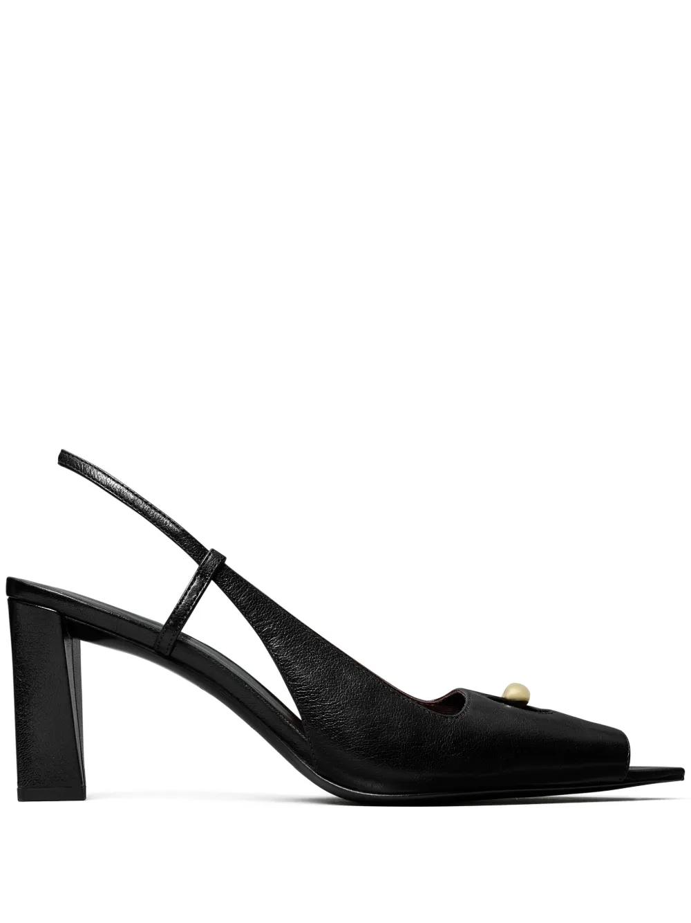 black slingback strap mid heel peep toe gold-tone hardware