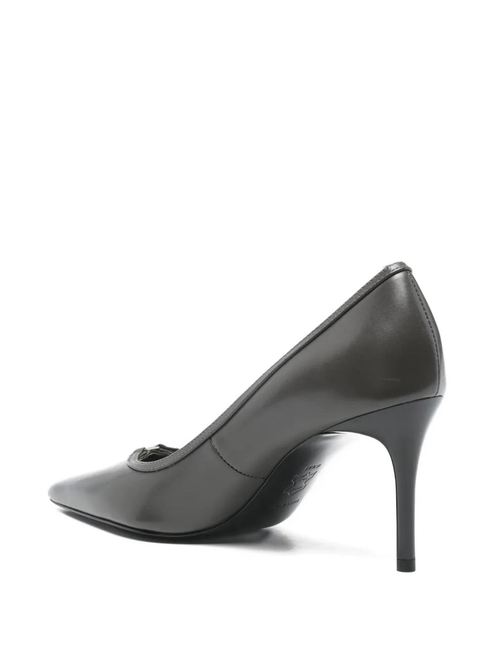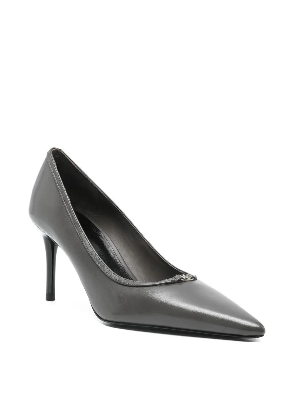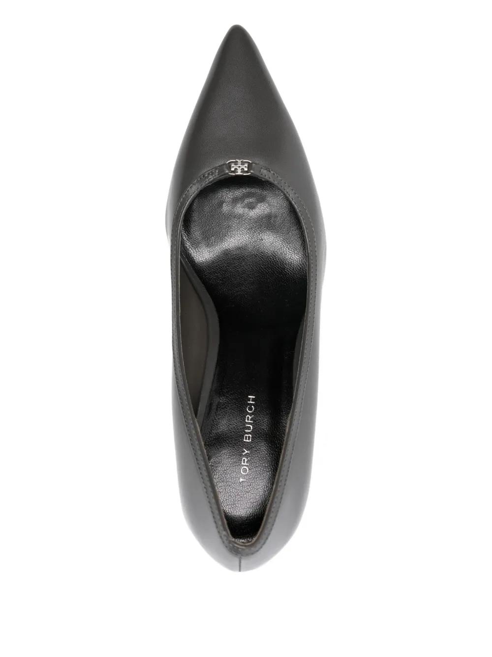 black pointed toe stiletto heel logo detail tonal stitching slip-on style