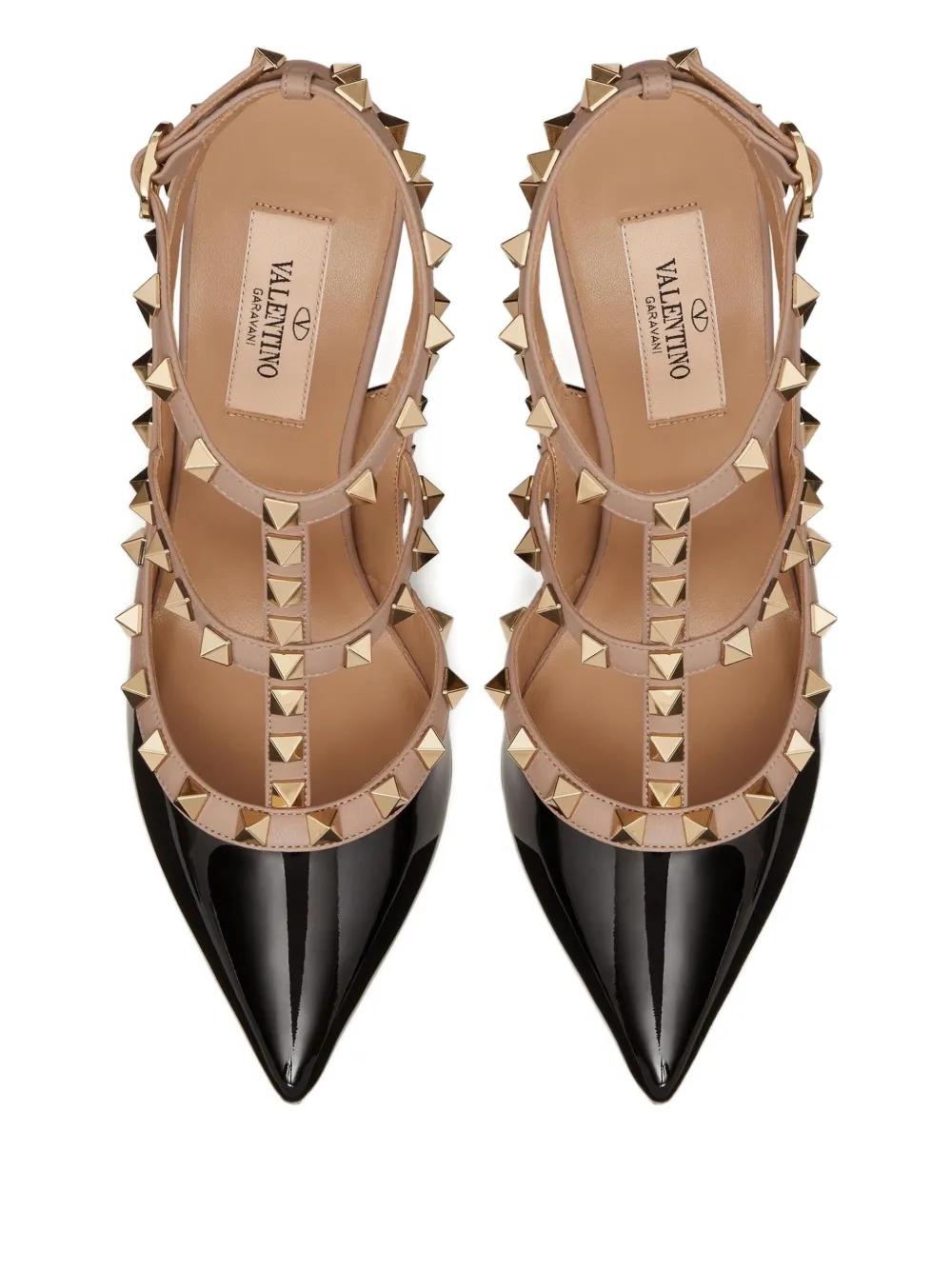 black/powder pink calf leather patent finish contrasting grained trim gold-tone Rockstud embellishment caged design pointed toe branded footbed leather lining 100mm high stiletto heel leather sole buckle-fastening ankle strap This piece comes complete with a protective dust bag.