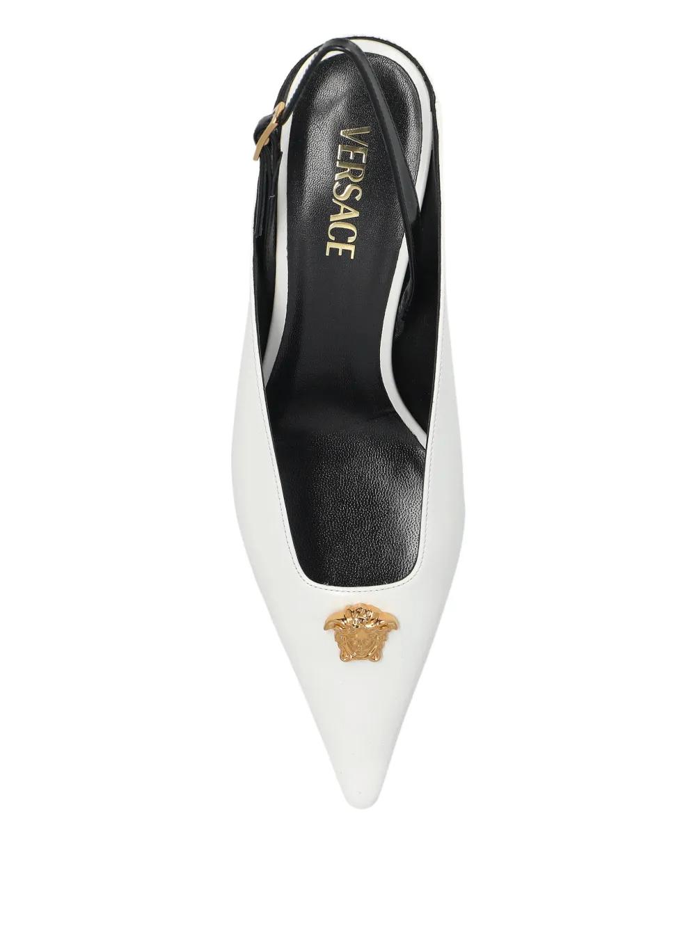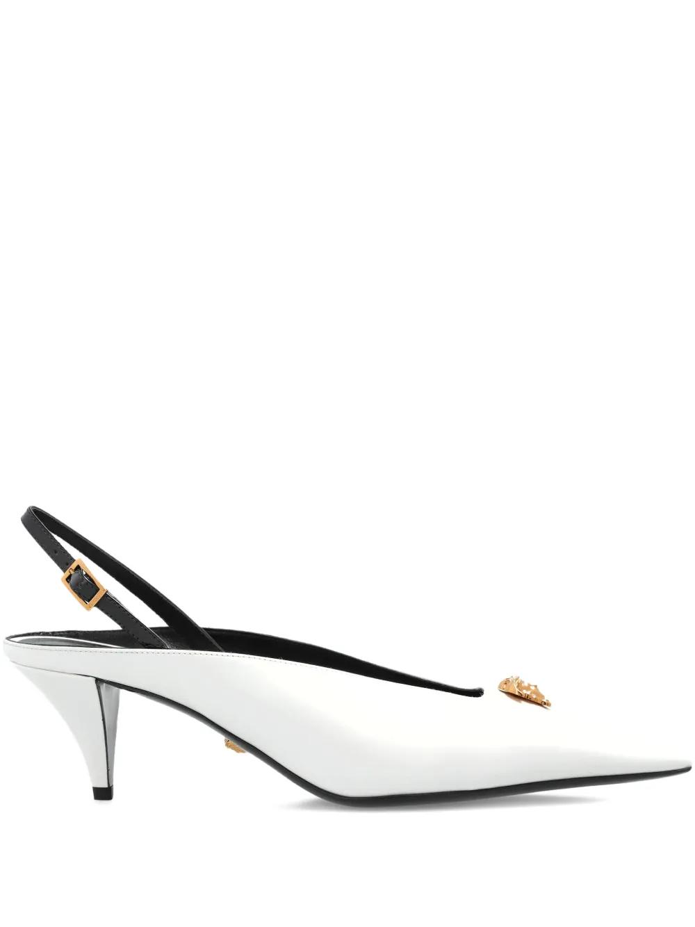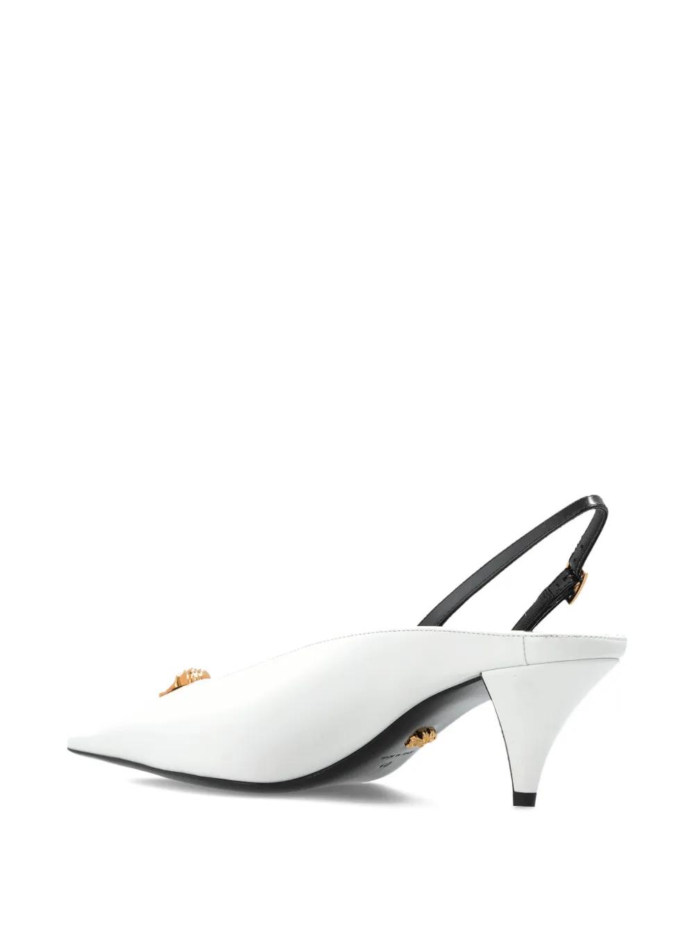 white gold-tone hardware slingback strap buckle fastening pointed toe cone heel