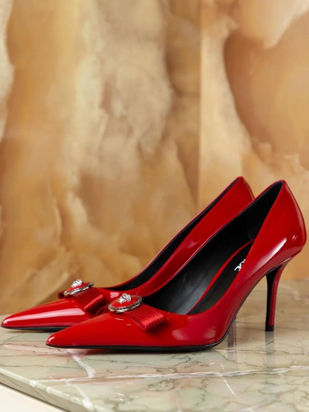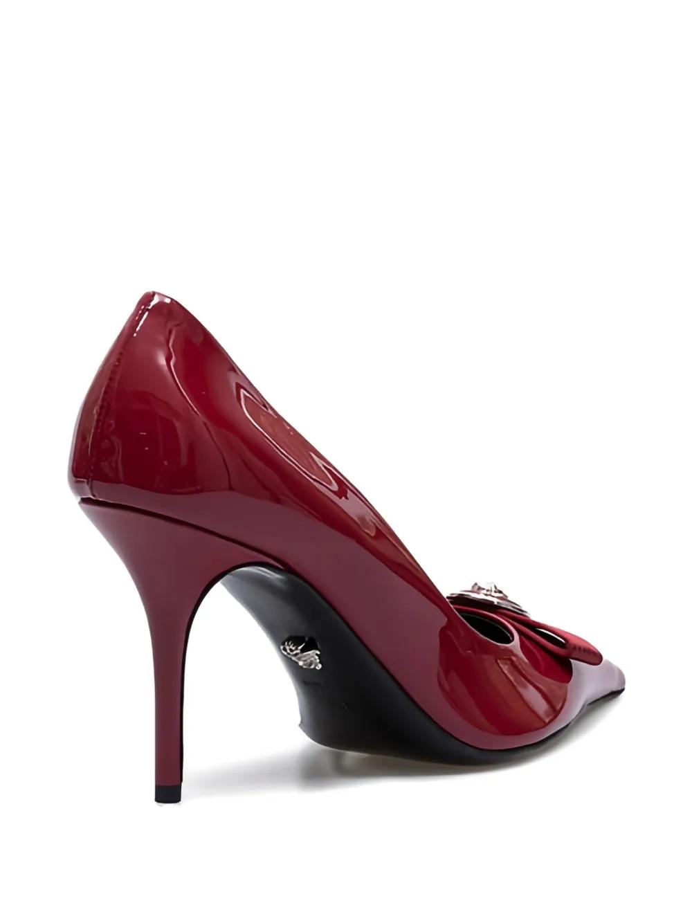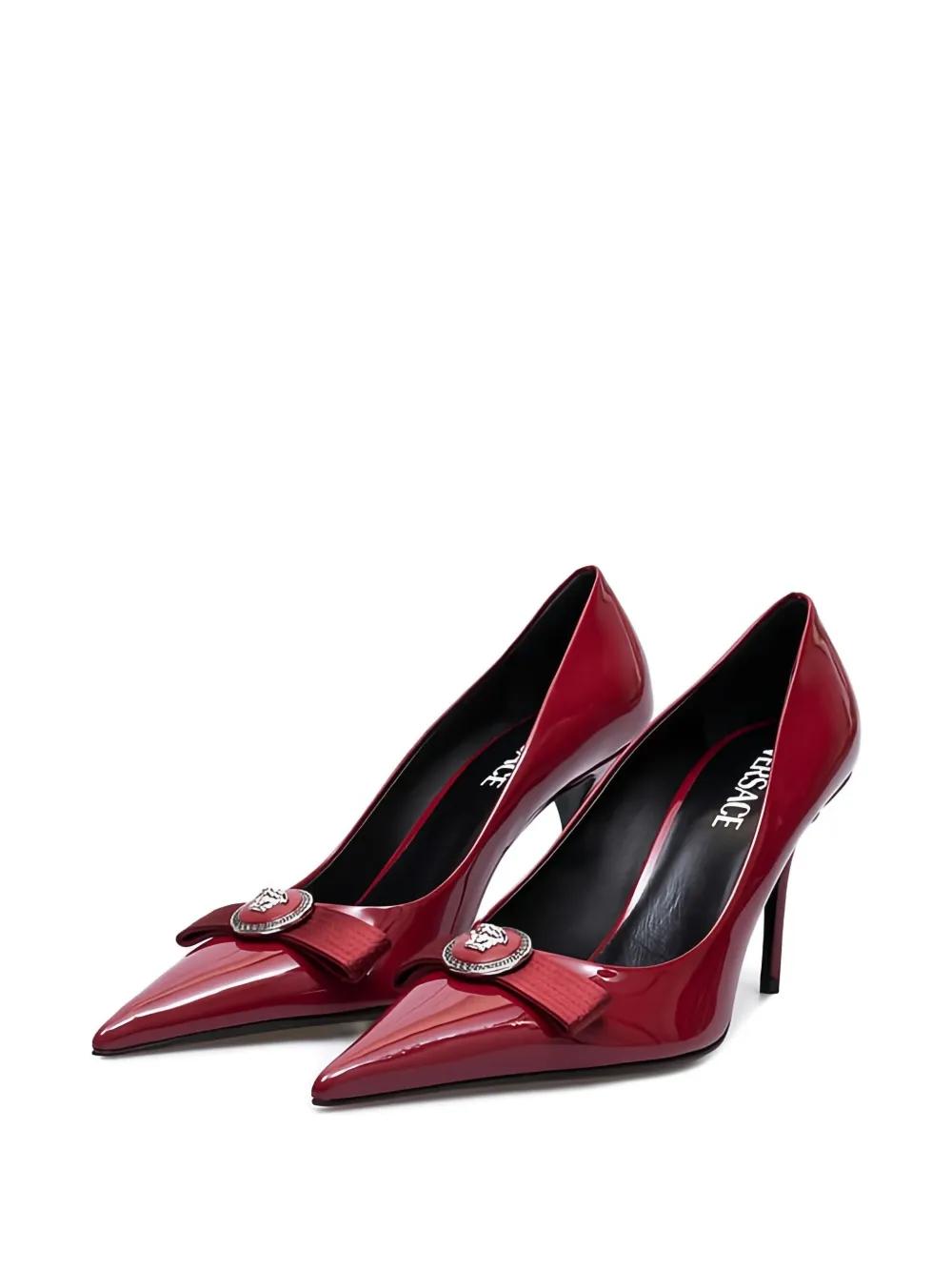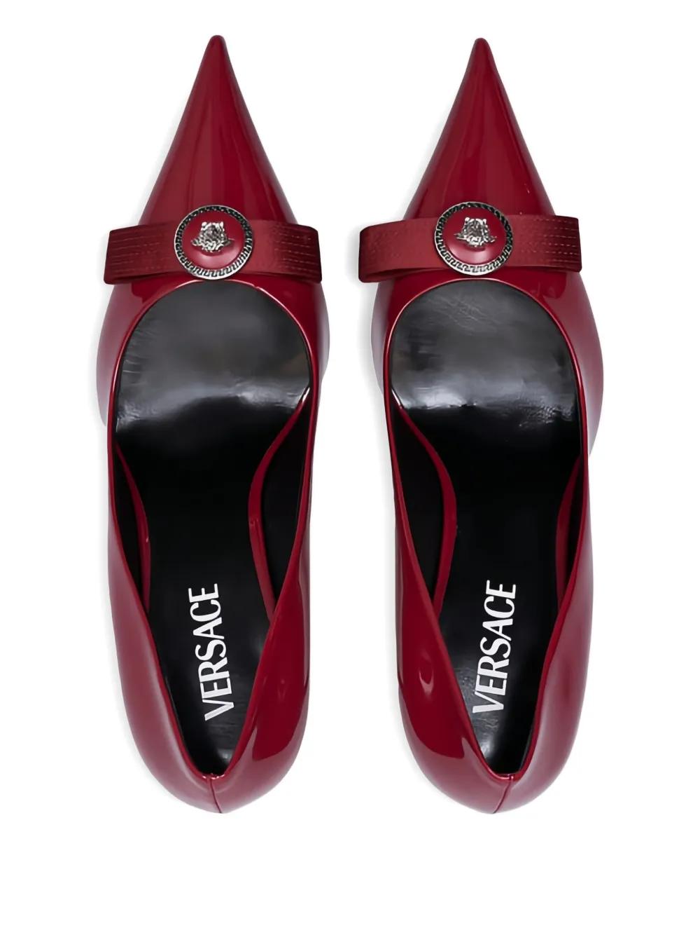 red patent leather pointed toe stiletto heel bow detail medusa emblem