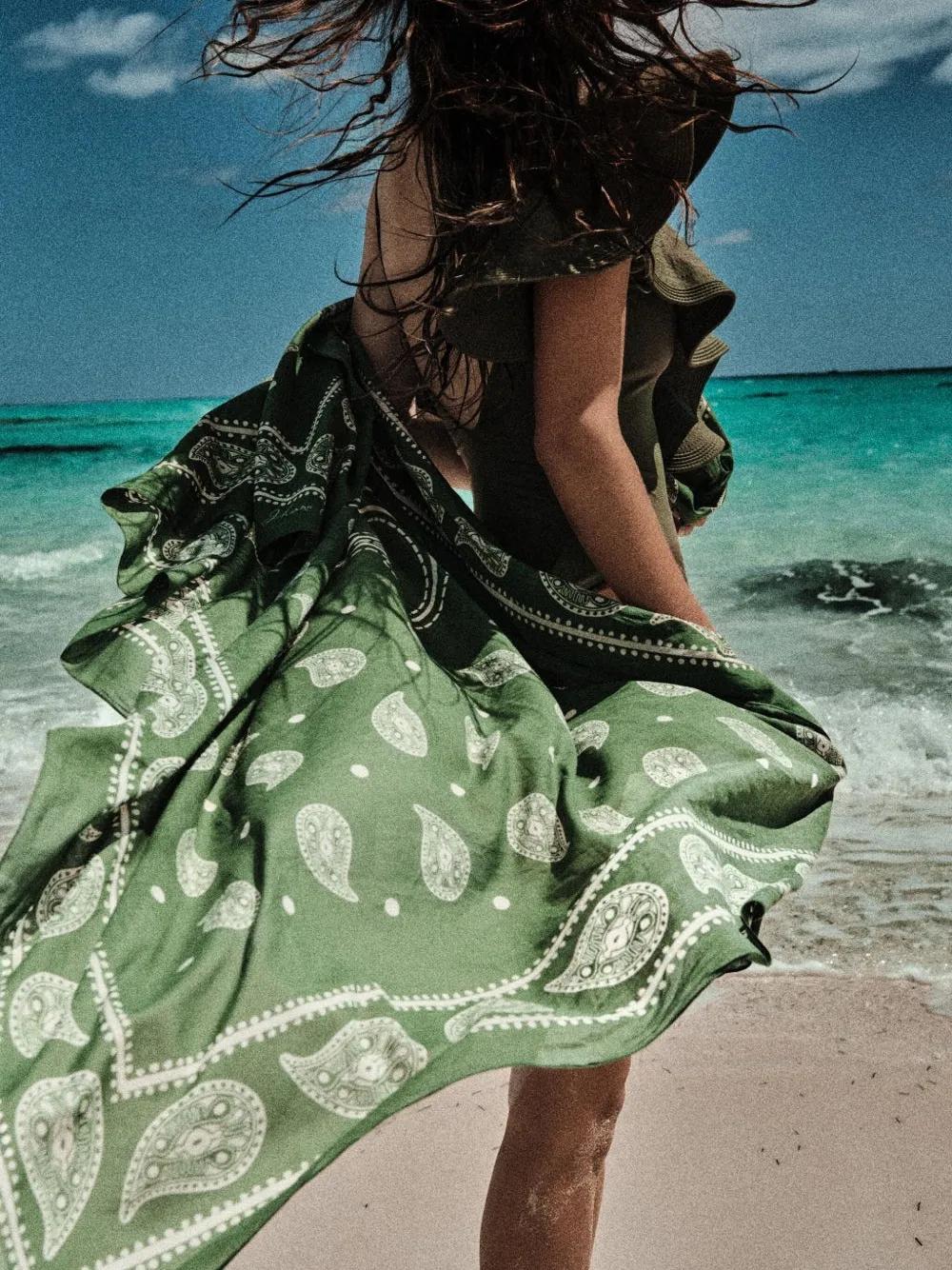 green cotton paisley print palm tree print rectangular shape This piece can be styled in multiple ways.