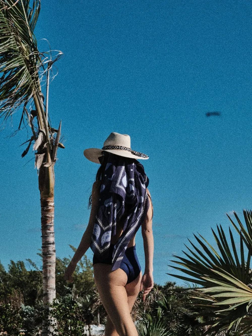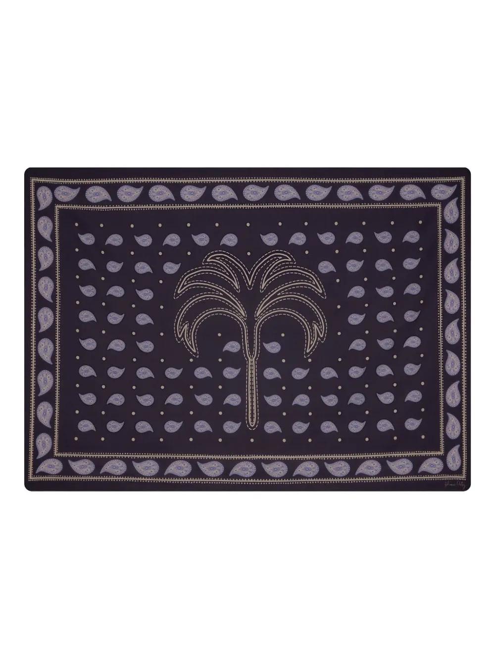 navy blue cotton paisley print palm tree motif contrasting trim finished edge cotton