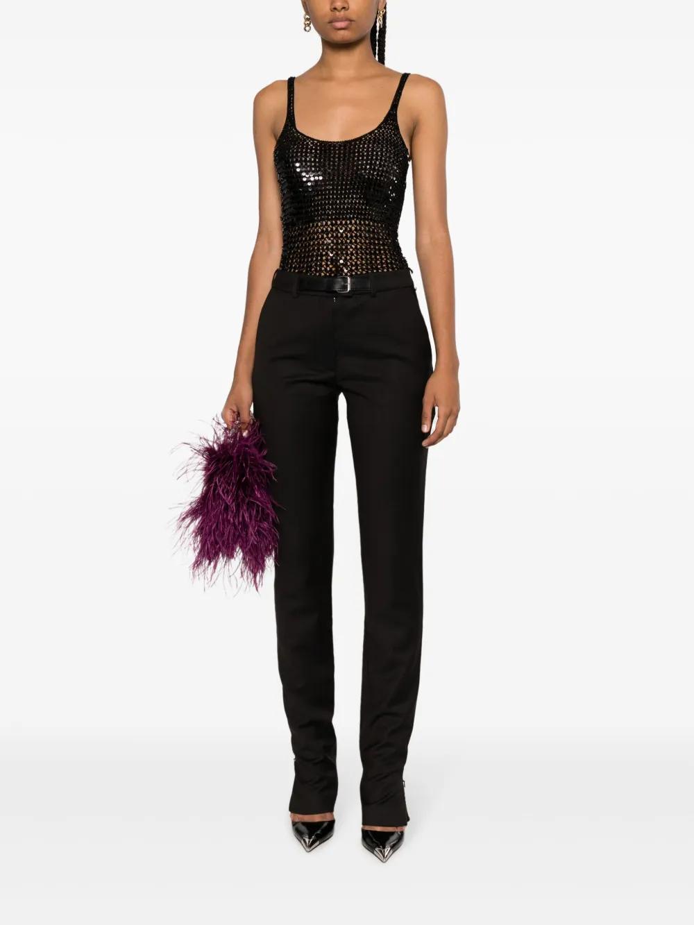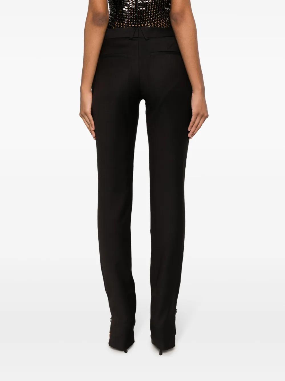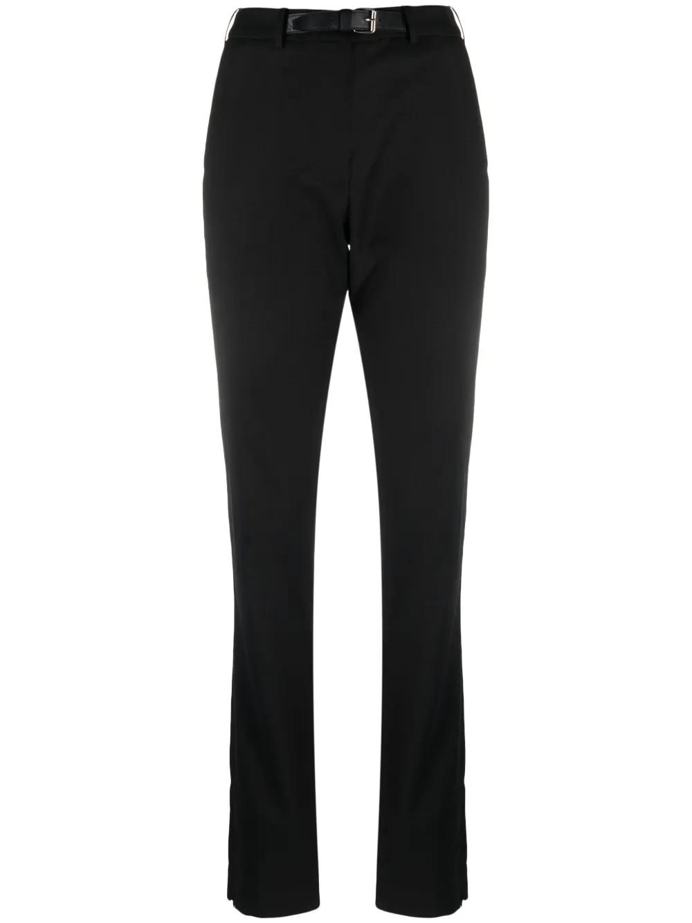 black virgin wool slim cut mid-rise belt loops buckle-strap fastening concealed front fastening two side inset pockets two rear welt pockets ankle zips