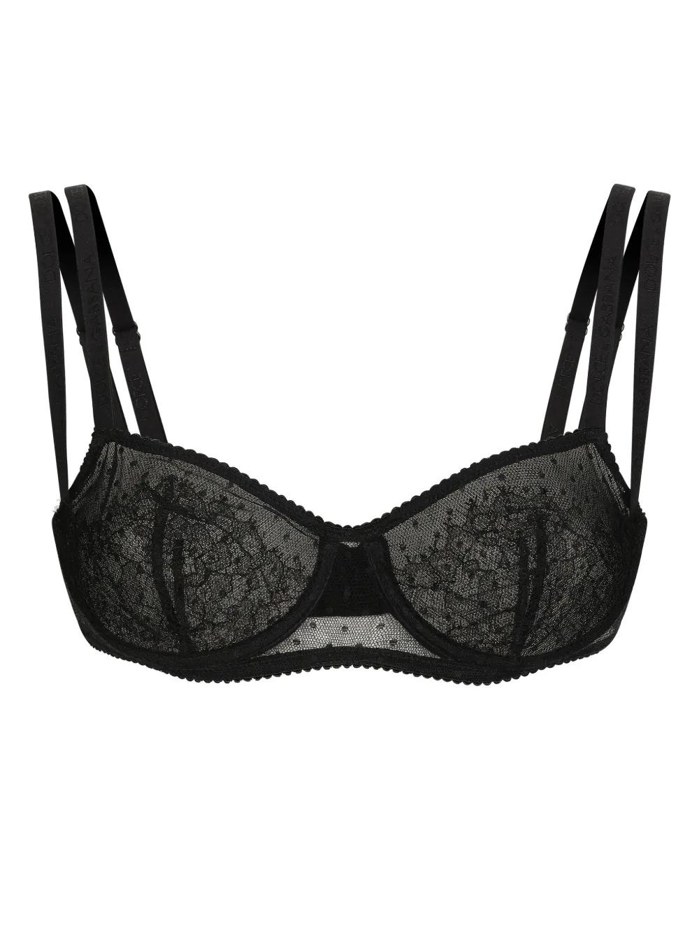 black point d'esprit tulle underwire cup two logo-embellished shoulder straps adjustable fit concealed rear hook and zip fastening