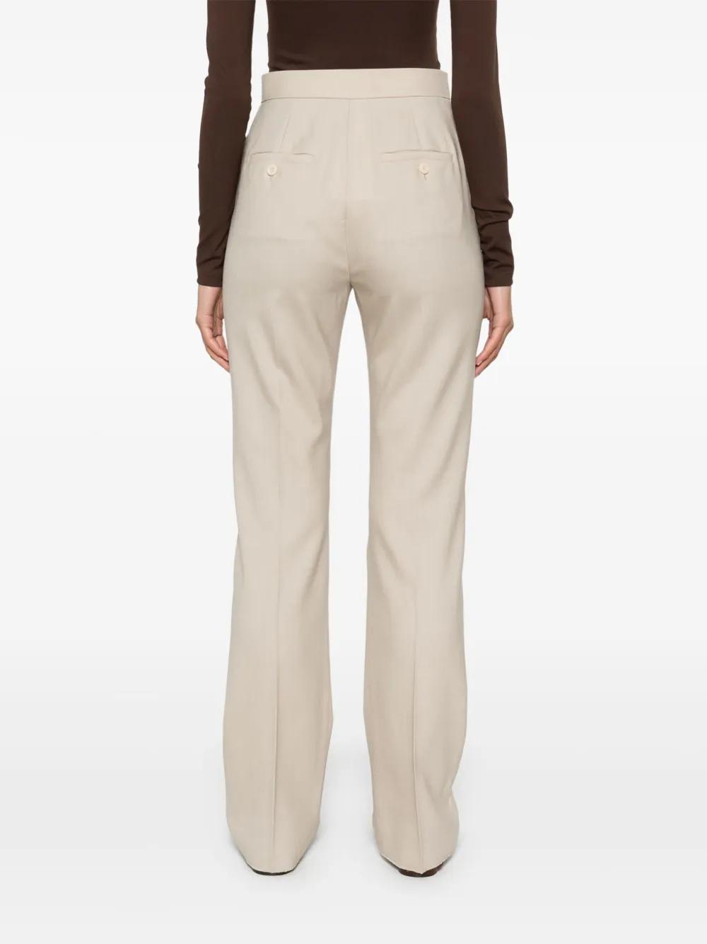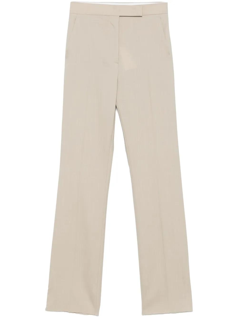 sand beige concealed front button, hook and zip fastening two diagonal pockets to the sides two rear welt pockets pressed crease