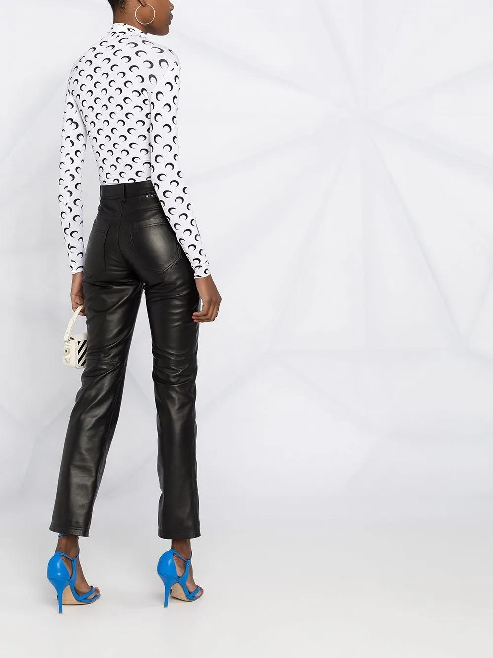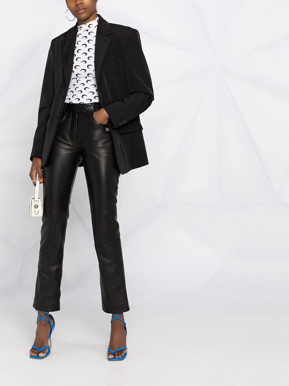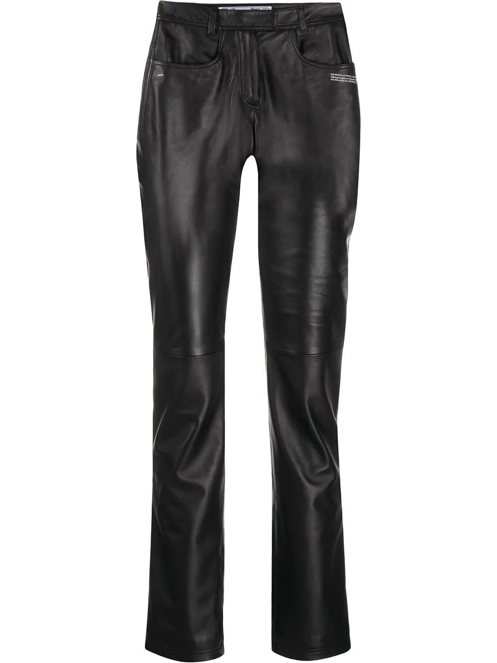 black leather polished finish slim fit cropped concealed front fastening belt loops two rounded pockets to the sides two rear patch pockets