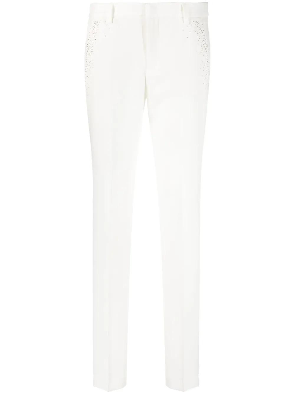 white stretch-design belt loops rhinestone embellishment concealed fly and button fastening two diagonal pockets to the sides straight hem