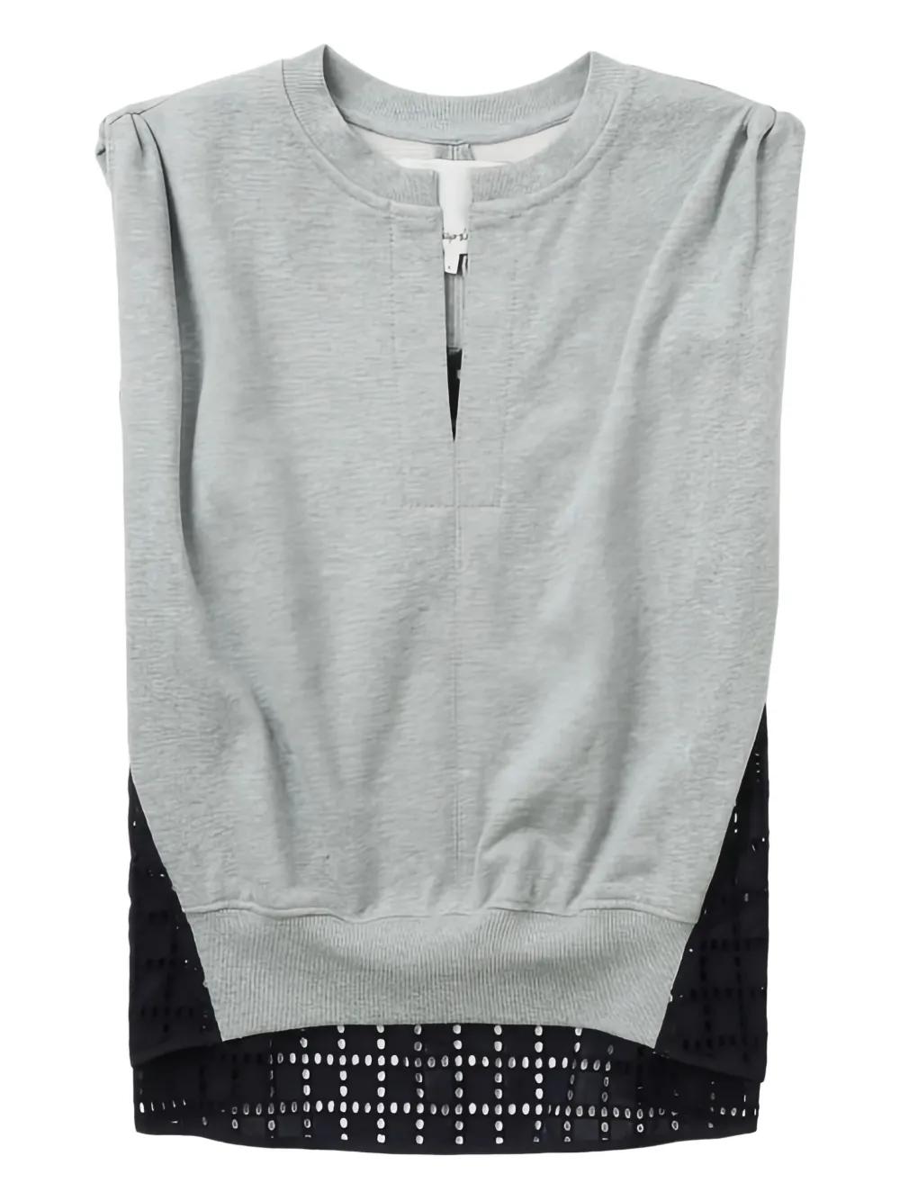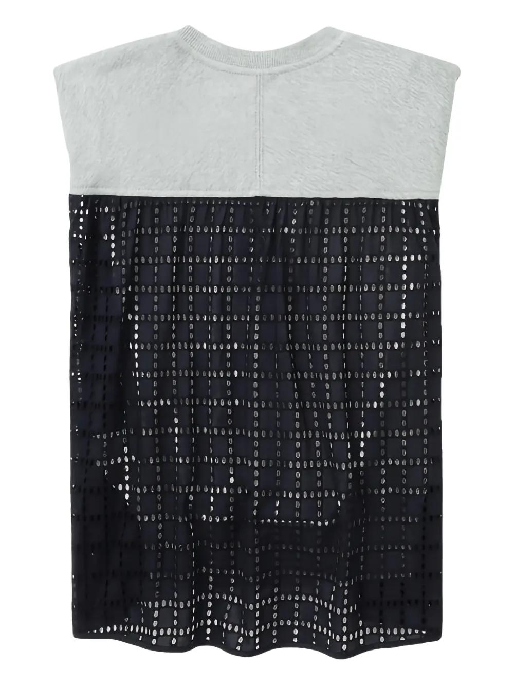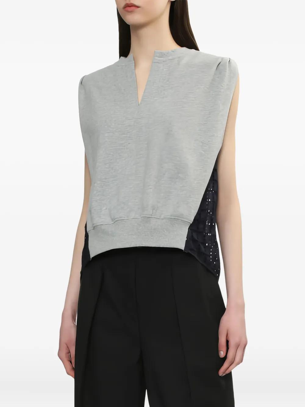 grey V-neck sleeveless padded shoulders eyelet panel panelled design