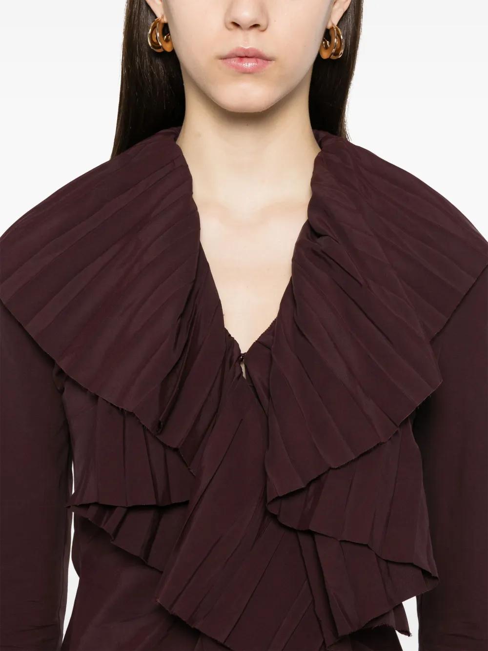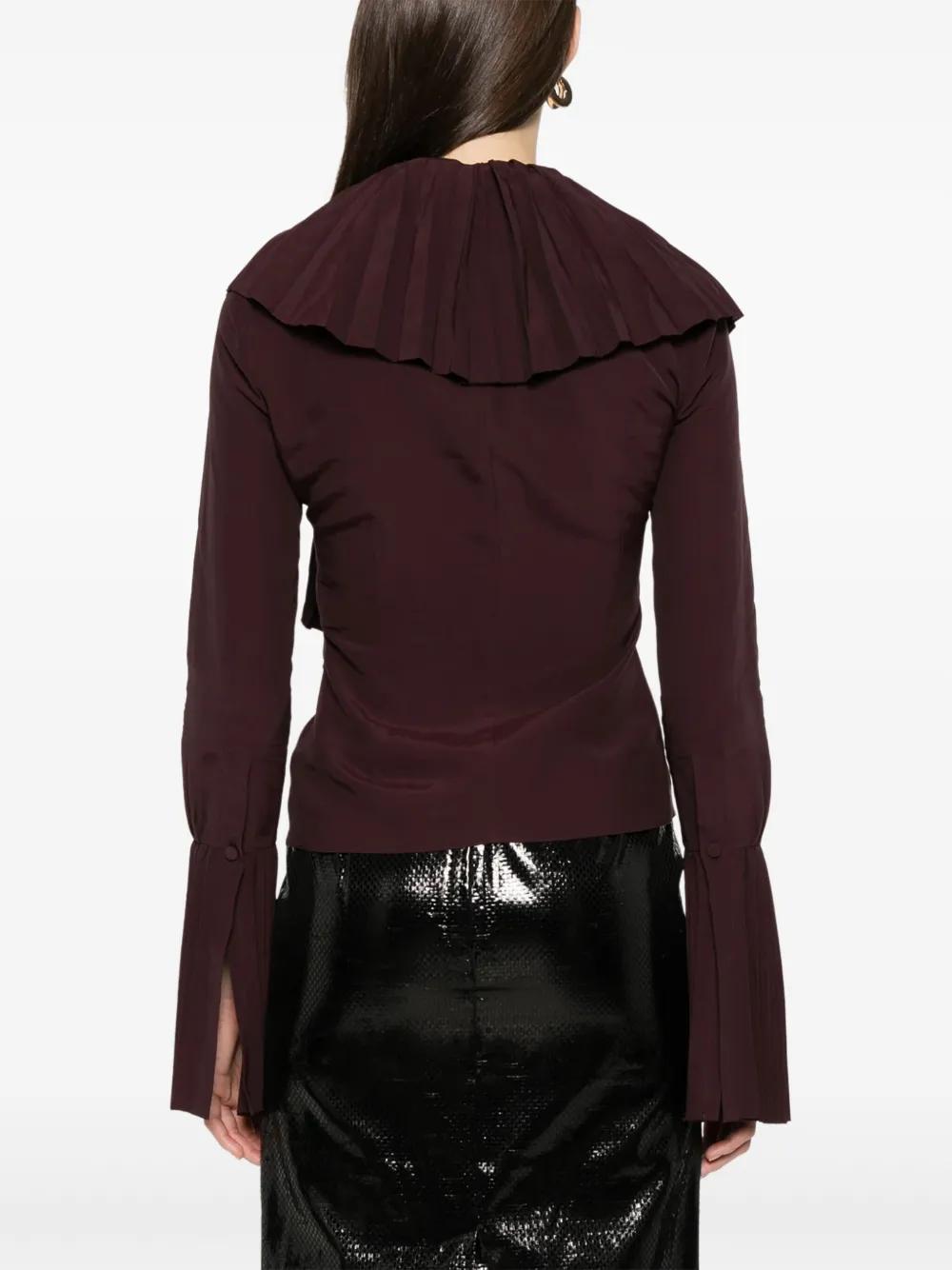 burgundy front hook and eye fastening dart detailing buttoned cuffs ruffled detailing