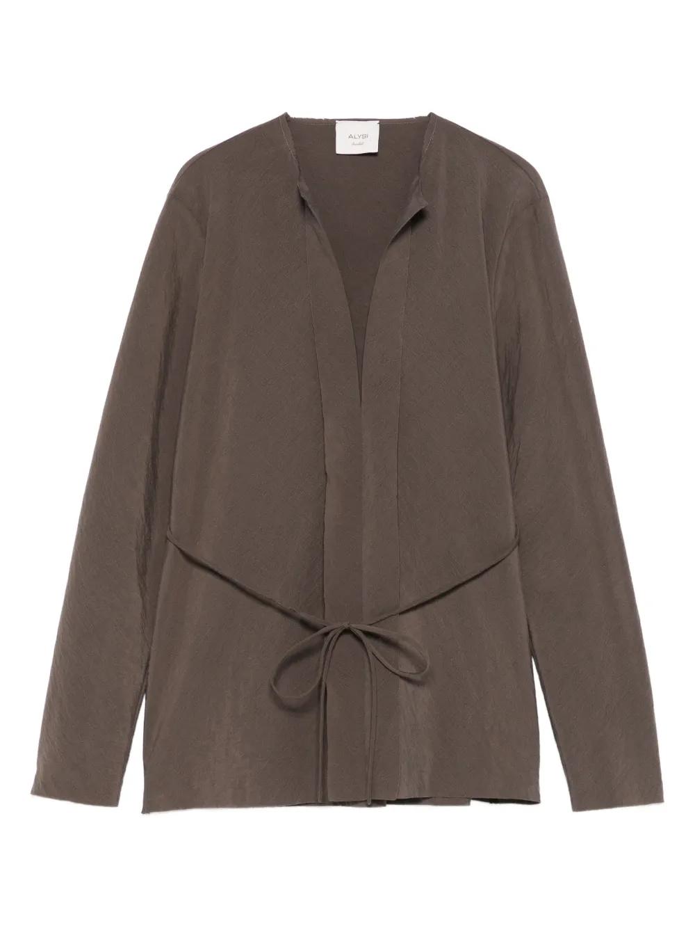 ecru/blue crepe texture all-over floral print lace trim to the neckline and hem V-neck small lapels short slit sleeves curved hem crystal-embellished buttons side button fastening