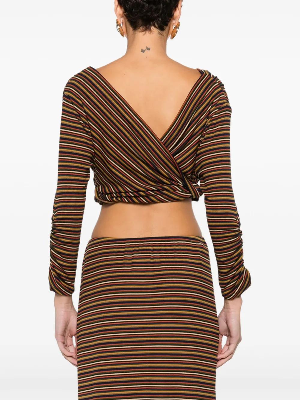 caramel brown striped wrap design V-neck three-quarter sleeves