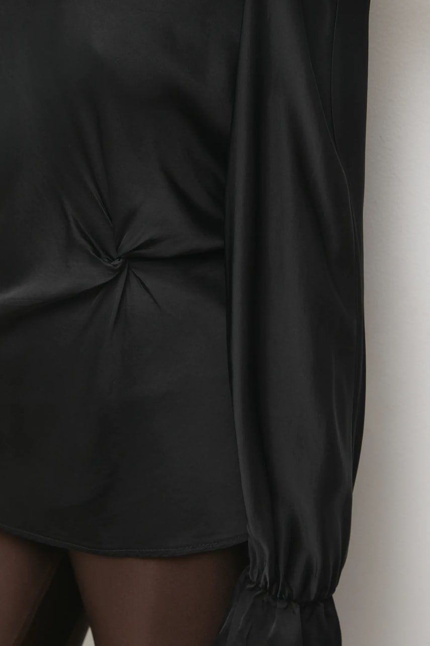 - Dopasowany, podkreślający sylwetkę fason. - Model wykonany z materiału o satynowym splocie. - Klasyczny, okrągły dekolt. - Cienka, nieelastyczna tkanina. - Długość rękawa(mierzona od dekoltu): 79 cm. - Długość: 69 cm. - Szerokość pod pachami: 49 cm. - Wymiary podane dla rozmiaru: S.