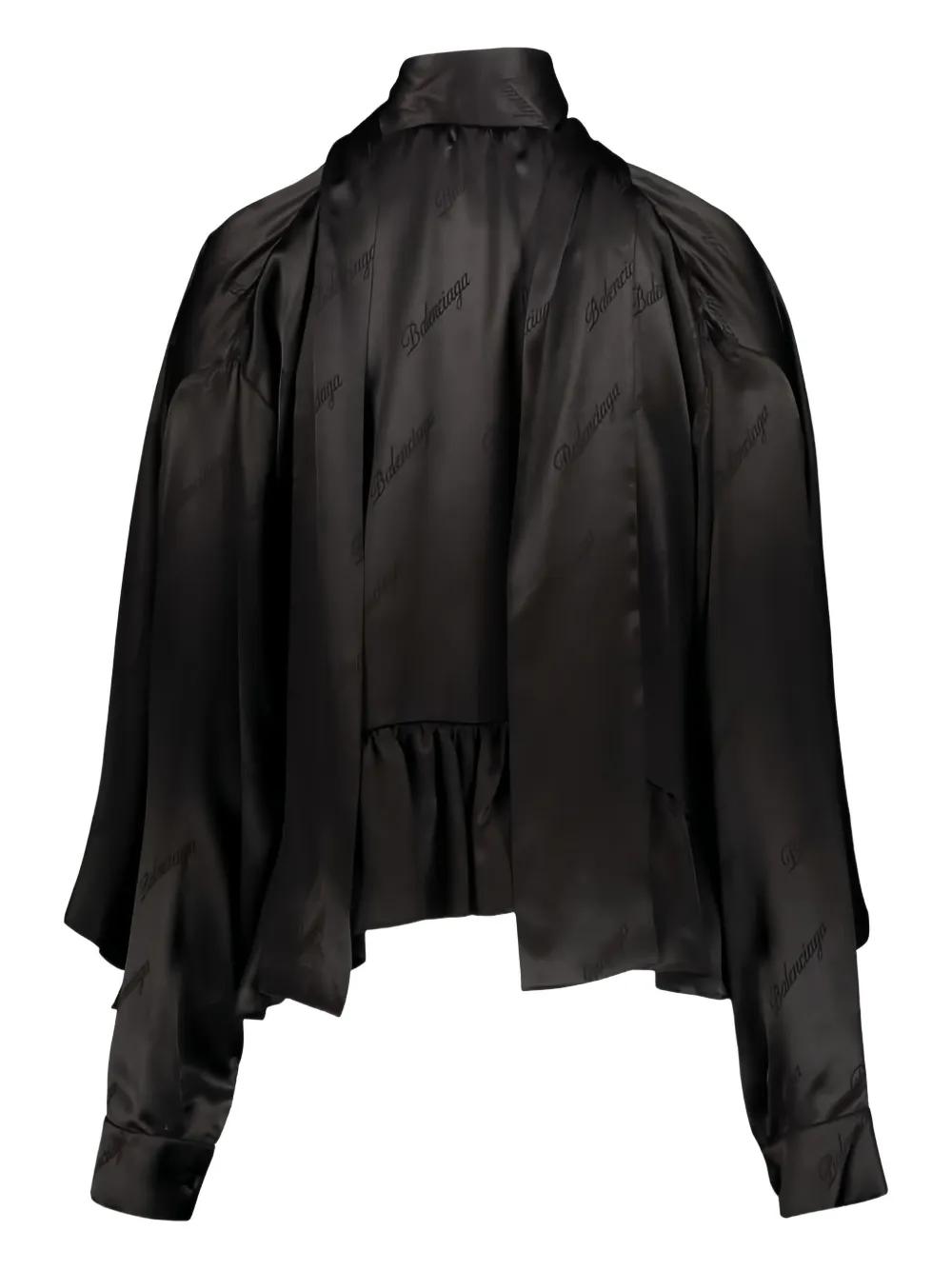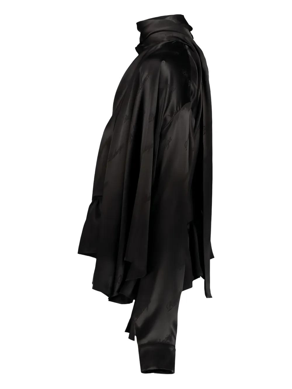 black all-over logo ruffled hem scarf collar long sleeves satin finish