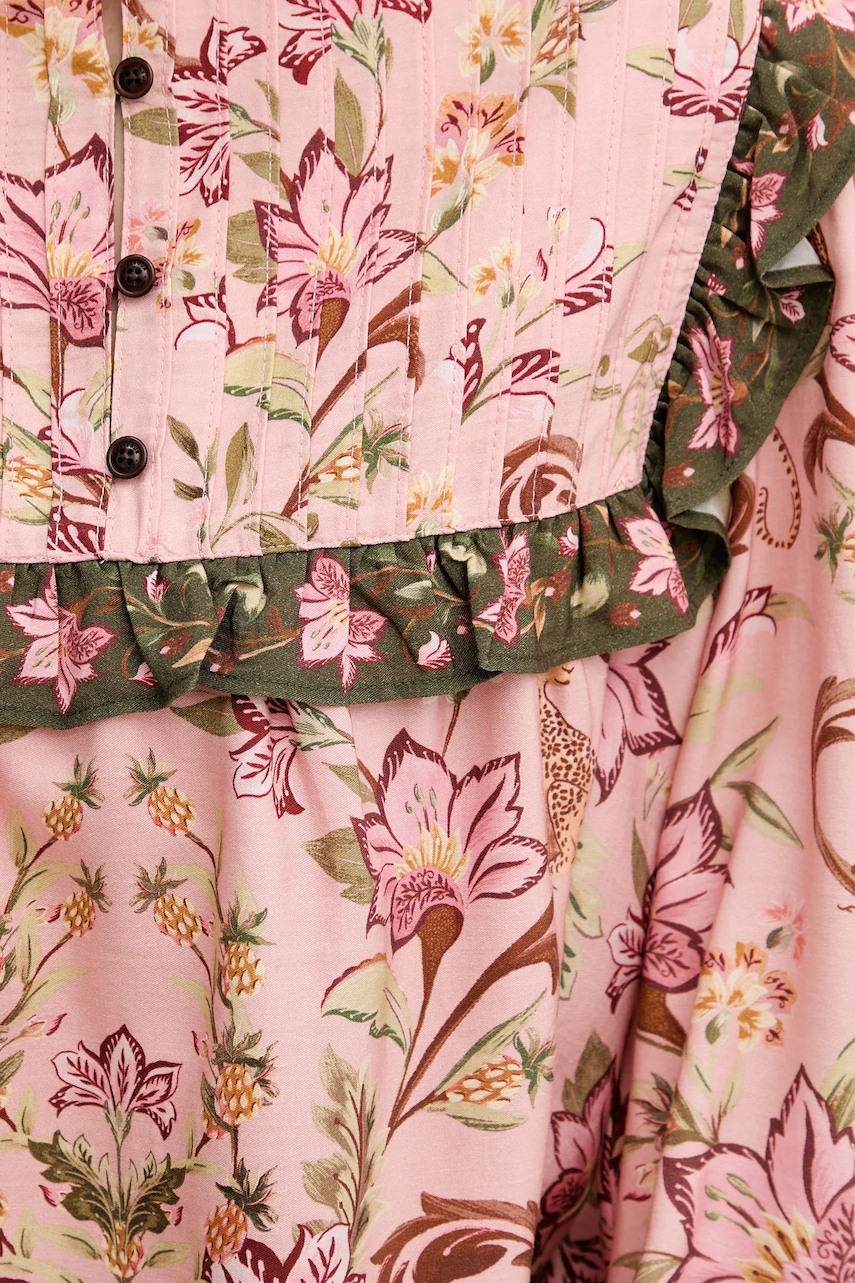 - Marka Farm Rio od 2019 roku współpracuje z organizacją One Tree Planted, a także z lokalnymi partnerami w Brazylii, takimi jak SOS Mata Atlântica, IDESAM, Instituto Curicaca, Instituto Homem Pantaneiro i Iniciativa Verde. Celem jest odbudowa ekosystemów w sześciu brazylijskich biomach: Amazonii, Atlantic Forest, Caatinga, Cerrado, Pampa i Pantanal. - B Corporation to certyfikat przyznawany firmom spełniającym najwyższe standardy w zakresie zweryfikowanych działań społecznych i środowiskowych oraz przejrzystości publicznej, aby zachować równowagę między zyskiem a celem. - Prosty, nie blokujący ruchów fason. - Krótkie zapięcie na guziki. - Model z ozdobnymi falbanami.