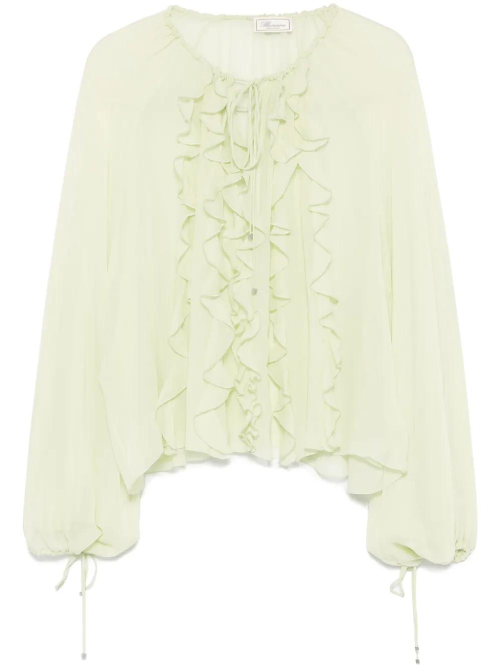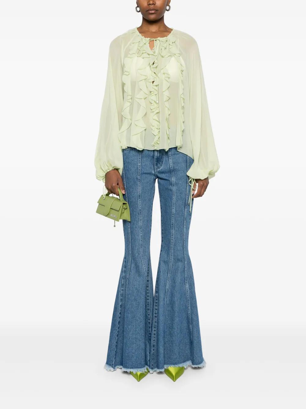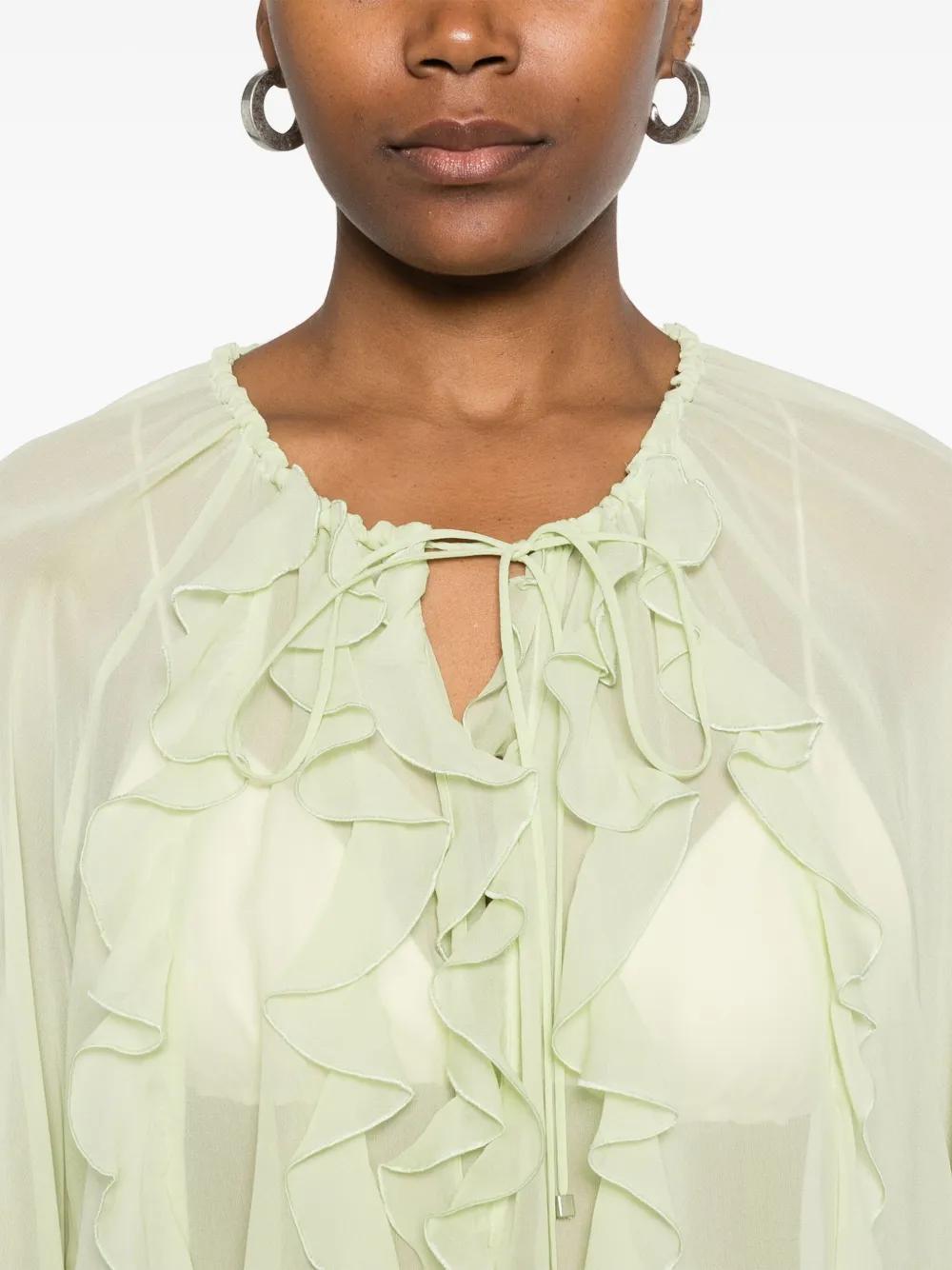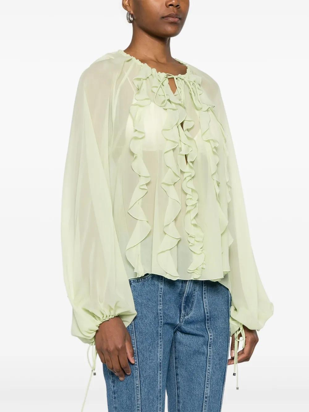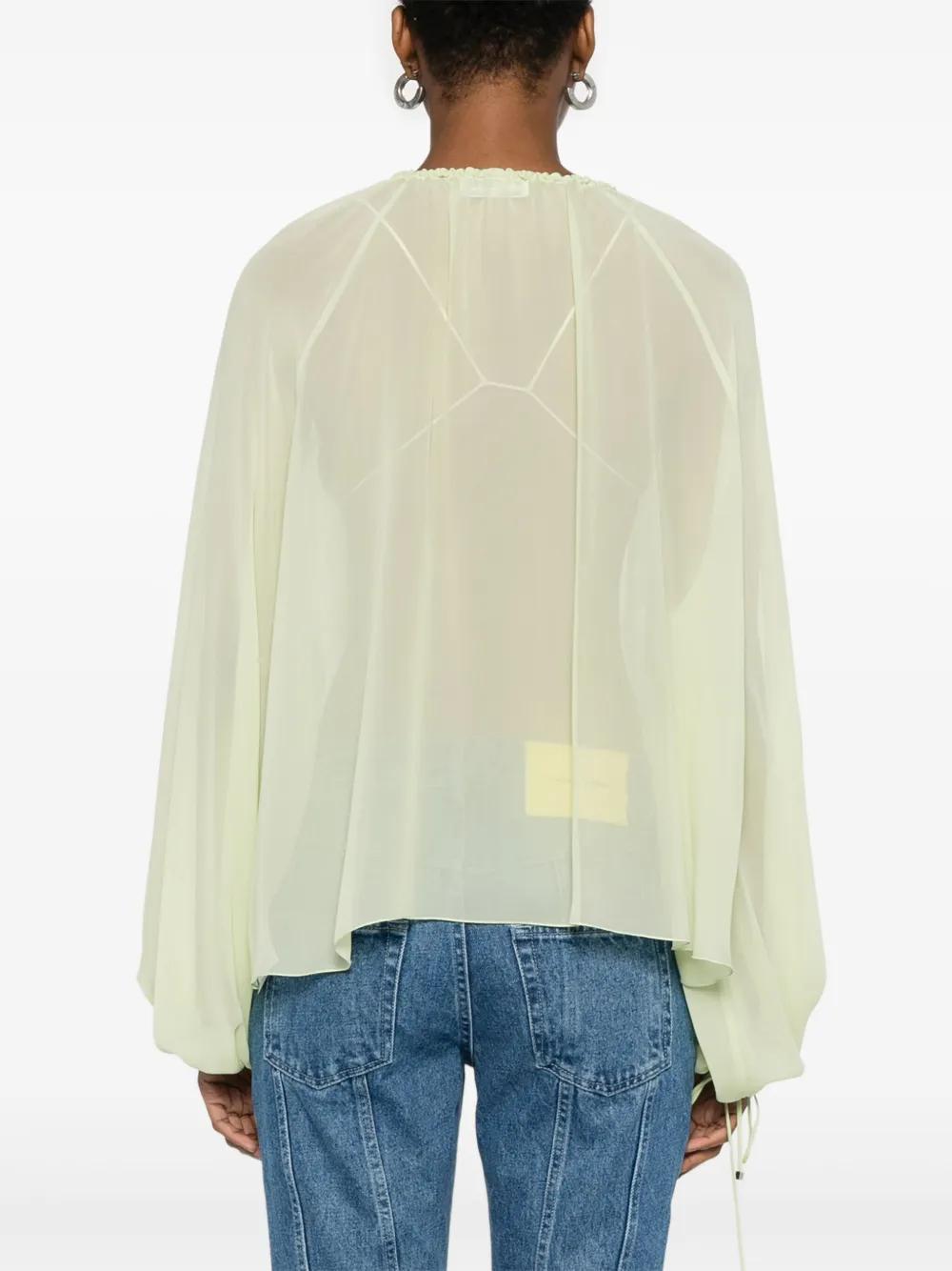 green front lace-up fastening semi-sheer construction round split neck balloon sleeves