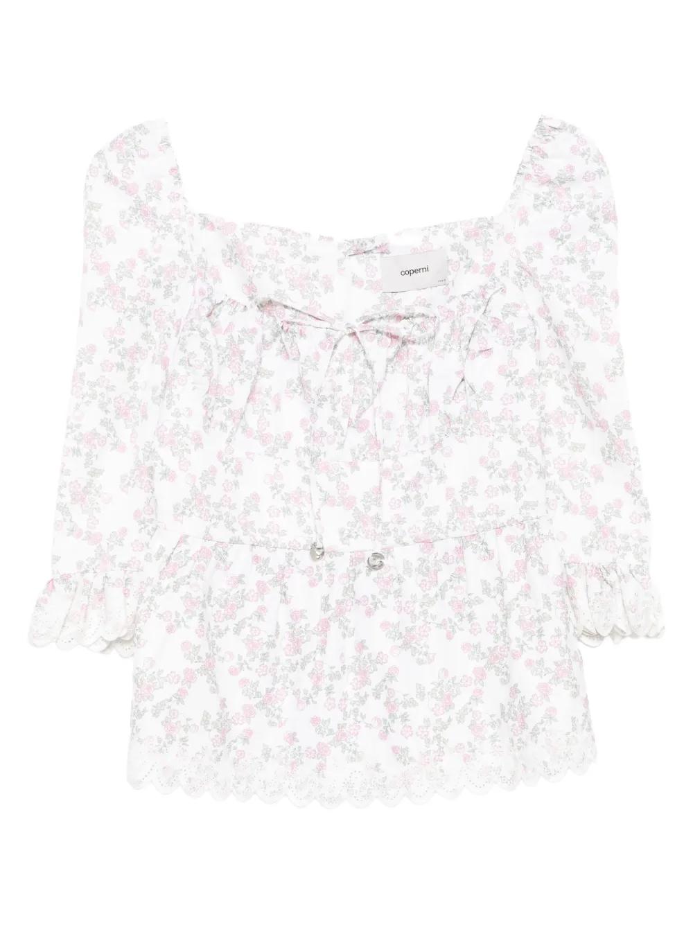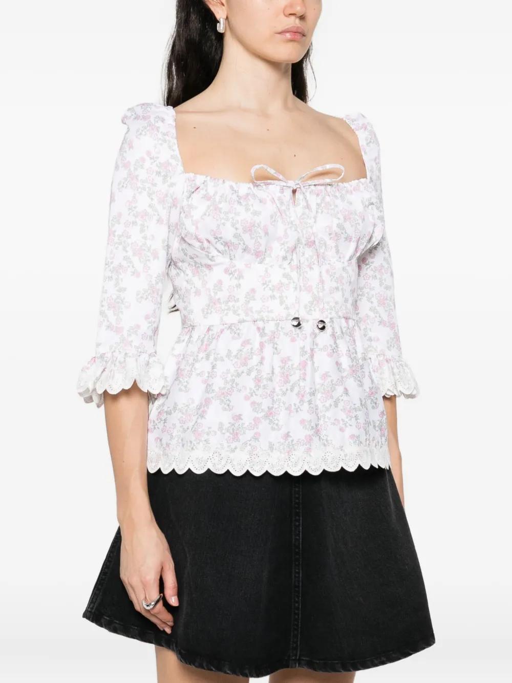 white floral print ruffled trim three-quarter sleeves lace-up fastening scalloped hem