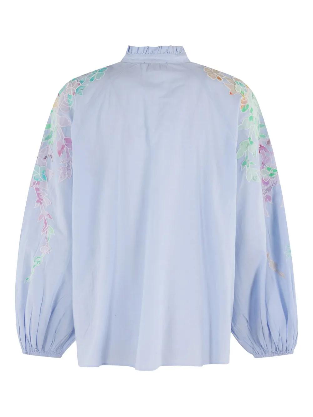 light blue floral embroidery band collar ruffled trim balloon sleeves elasticated cuffs