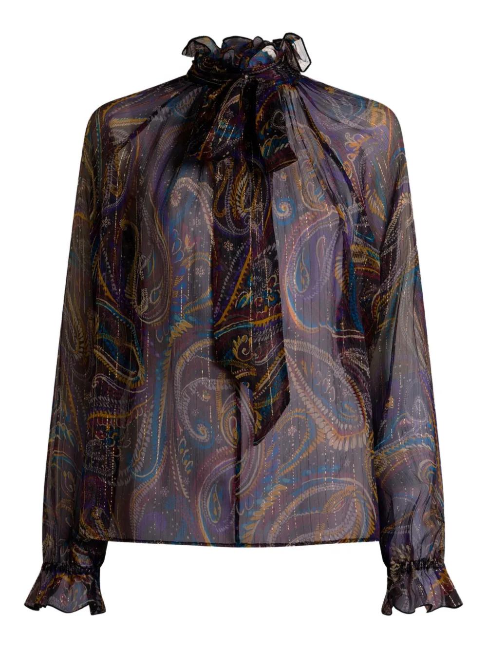 purple multicoloured paisley foliage motif ruffled collar tie detail long sleeves elasticated cuffs