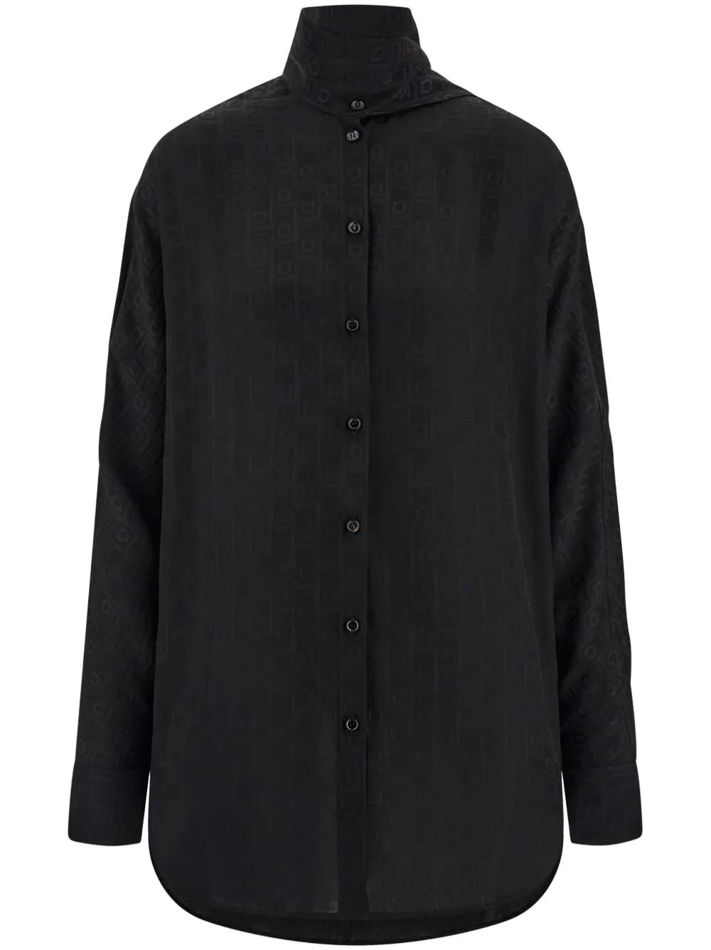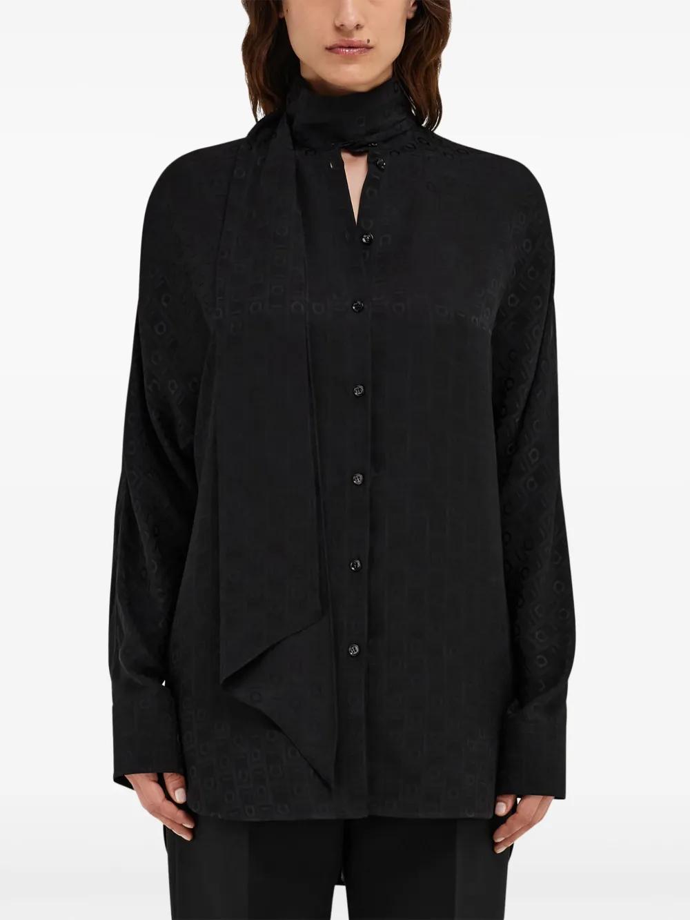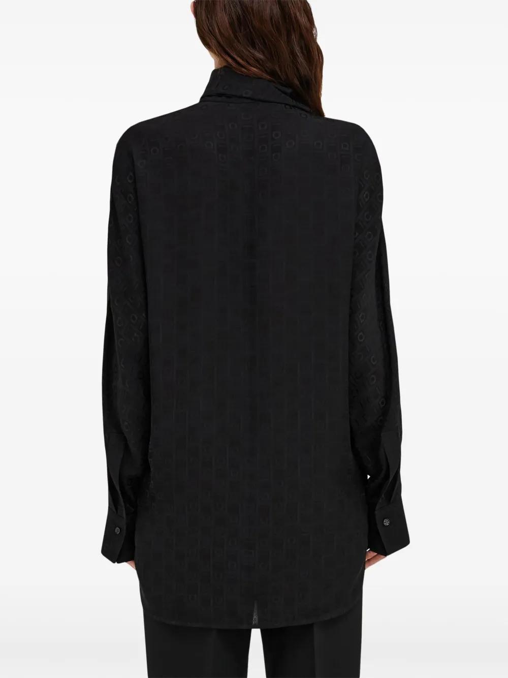 black silk sash detail front button fastening monogram pattern drop shoulder long sleeves buttoned cuffs curved hem