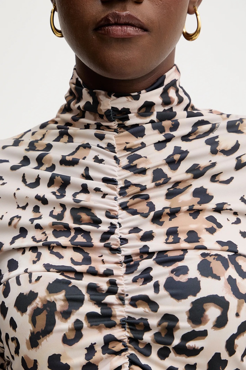 - Dopasowany, podkreślający sylwetkę fason. - Model z półgolfem. - Dopasowany fason z efektownymi marszczeniami. - Długość rękawa: 56 cm. - Długość: 51 cm. - Szerokość pod pachami: 36 cm. - Wymiary podane dla rozmiaru: S.