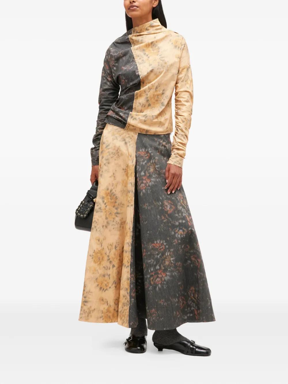 yellow floral print asymmetrical neck long sleeves gathered detailing