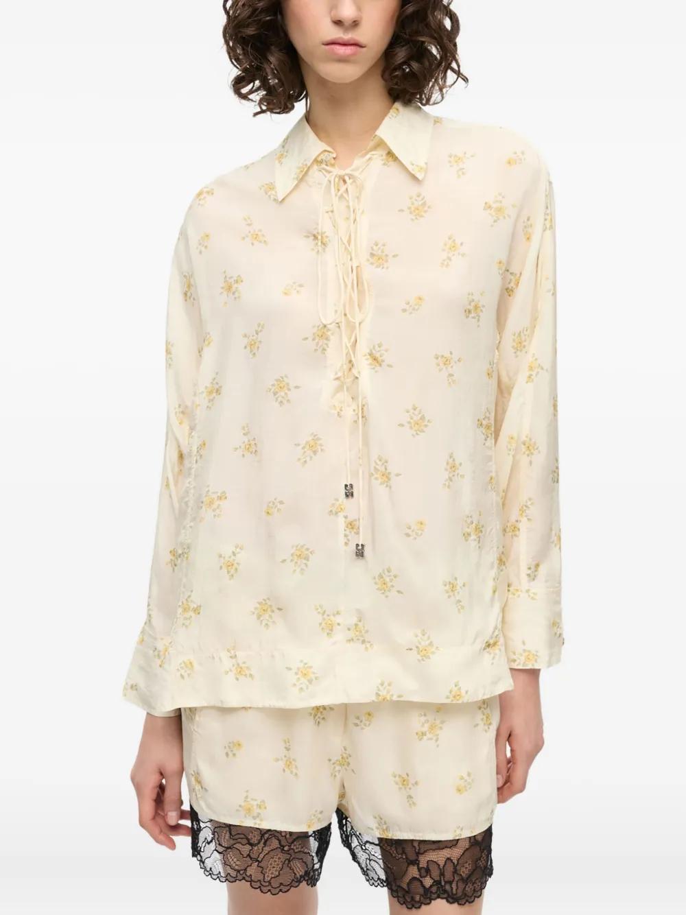 light beige front tie fastening buttoned cuffs long sleeves curved hem