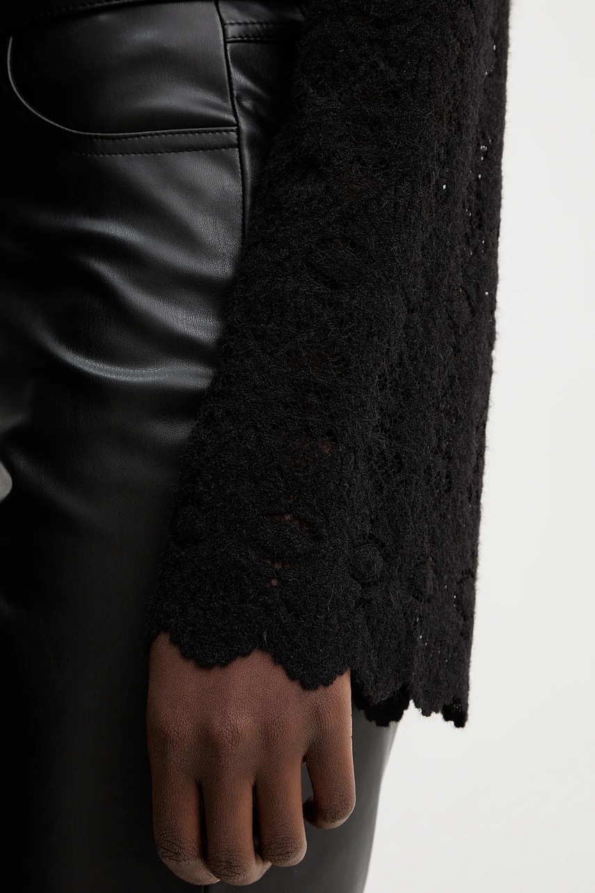 - Prosty, nie blokujący ruchów fason. - Dodatkowa warstwa materiału w postaci podszewki. - Klasyczny, okrągły dekolt. - Z tyłu zapięcie na guzik. - Rozszerzany rękaw. - Długość rękawa: 68 cm. - Długość: 55 cm. - Szerokość pod pachami: 40 cm. - Wymiary podane dla rozmiaru: S.