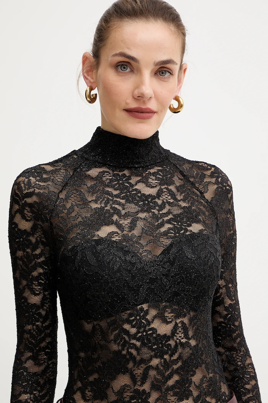 - Dopasowany model w fasonie body. - Model z półgolfem. - Model wykonany z transparentnego materiału. - Rękaw raglanowy, dzięki swojej konstrukcji, zapewnia większą swobodę ruchu. - Z tyłu zapięcie na guziki. - Długość rękawa(mierzona od dekoltu): 70 cm. - Długość: 71 cm. - Szerokość pod pachami: 38 cm. - Wymiary podane dla rozmiaru: S.
