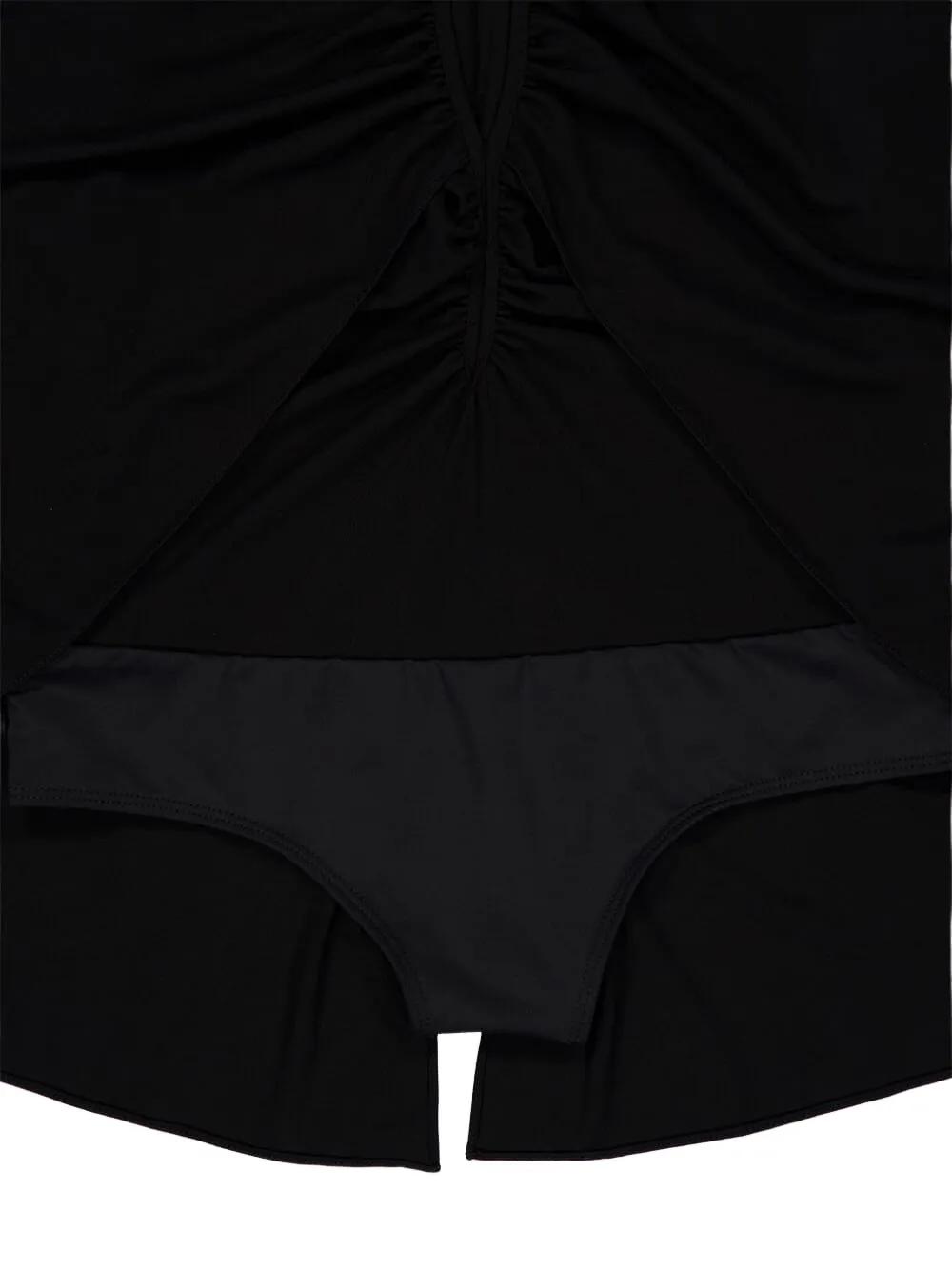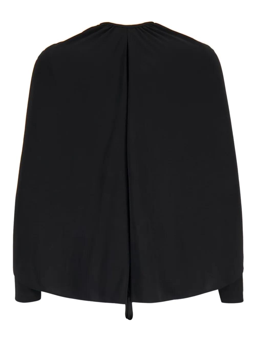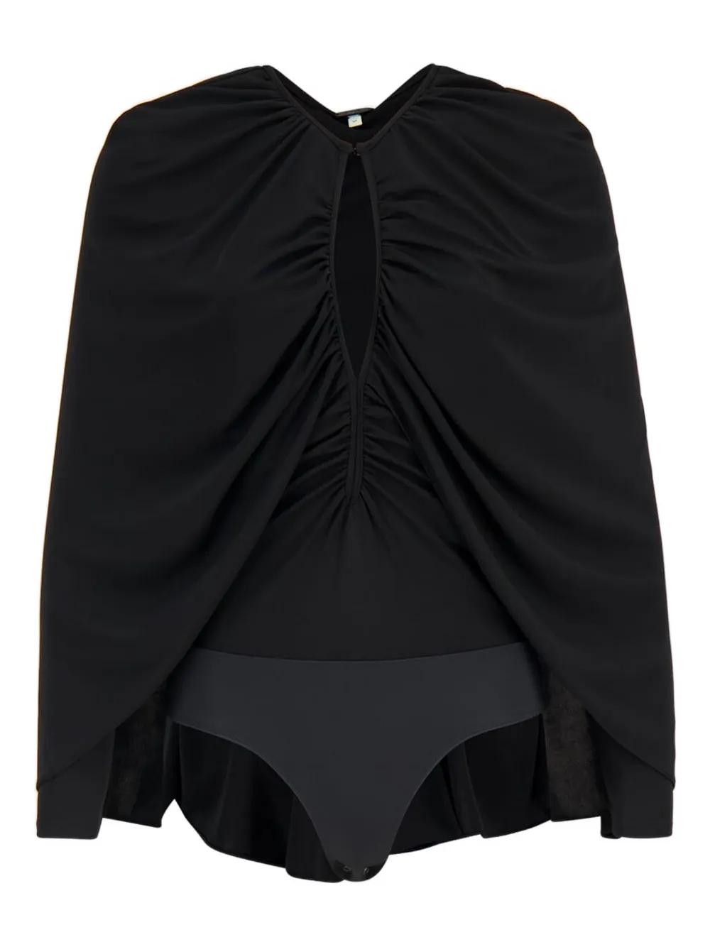 black draped detailing keyhole neckline gathered front long sleeves Just a reminder that this piece must be tried on over your own garments.