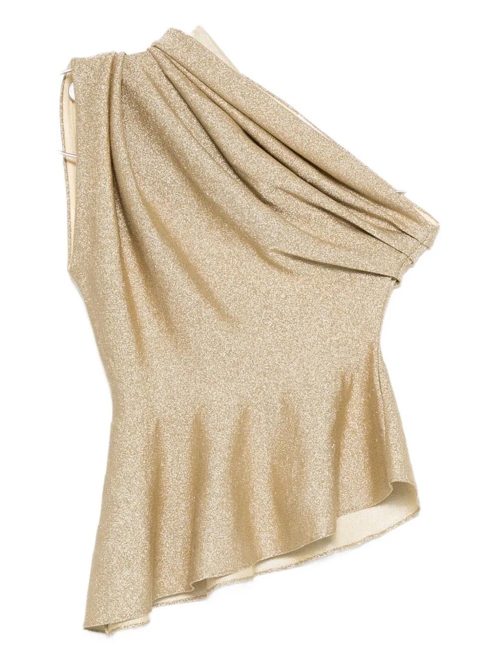 gold one-shoulder design draped detailing peplum hem
