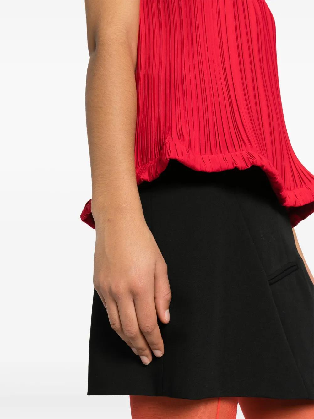 blood red crepe de chine fully pleated round neck sleeveless ruffle hem front button placket