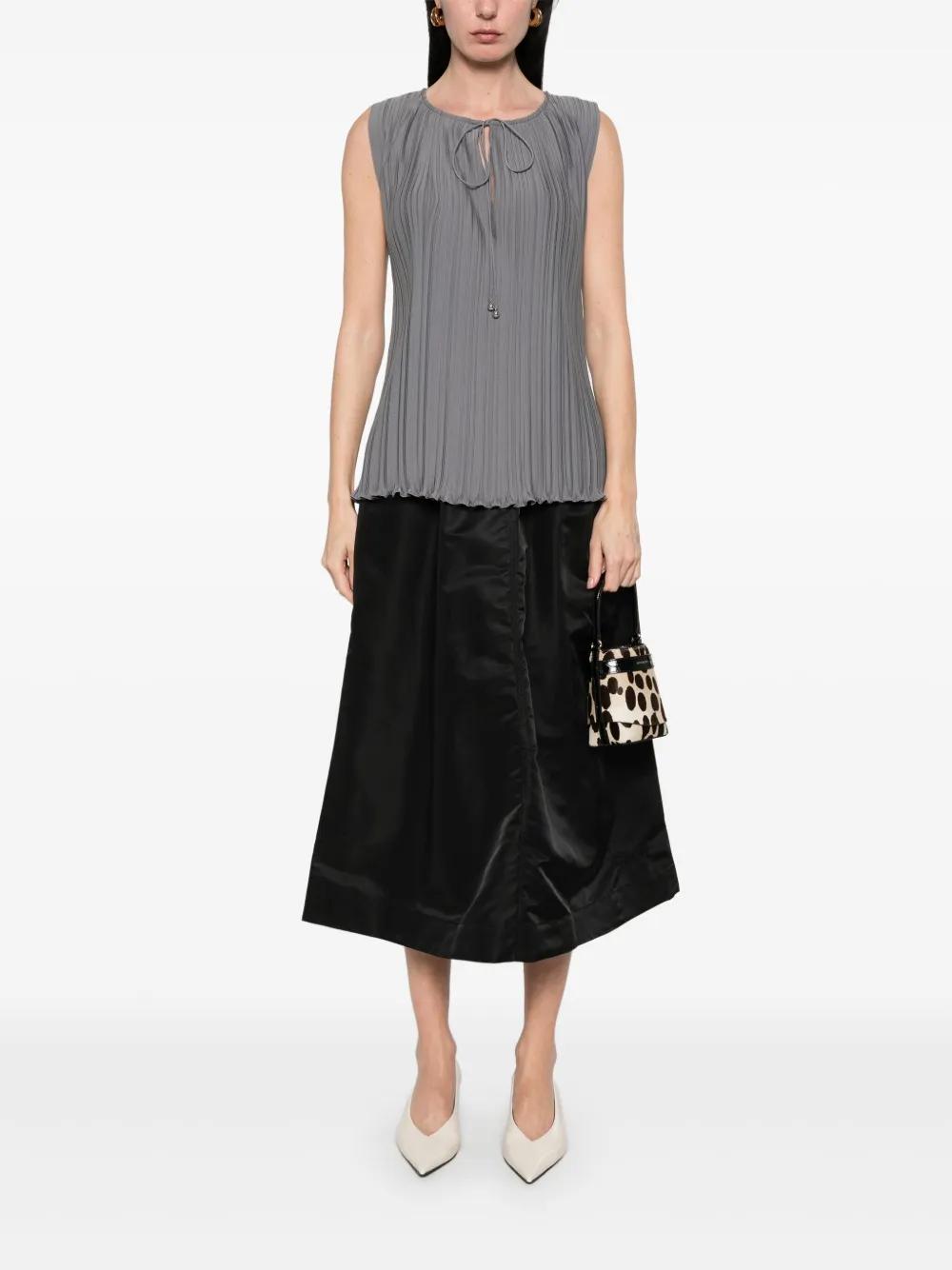 white/black satin weave polka dot print gathered tie neck long sleeves buttoned cuffs front button fastening curved hem