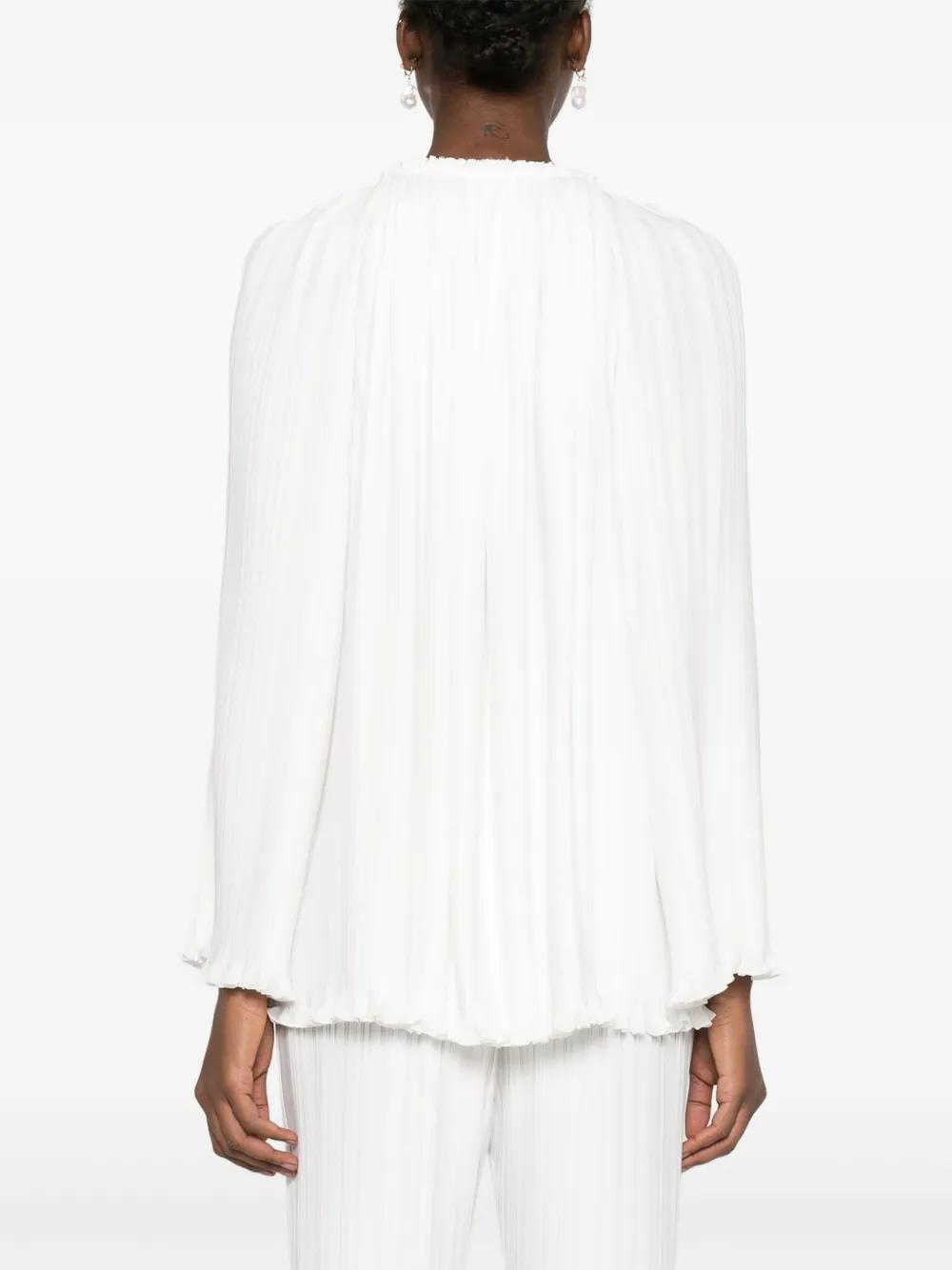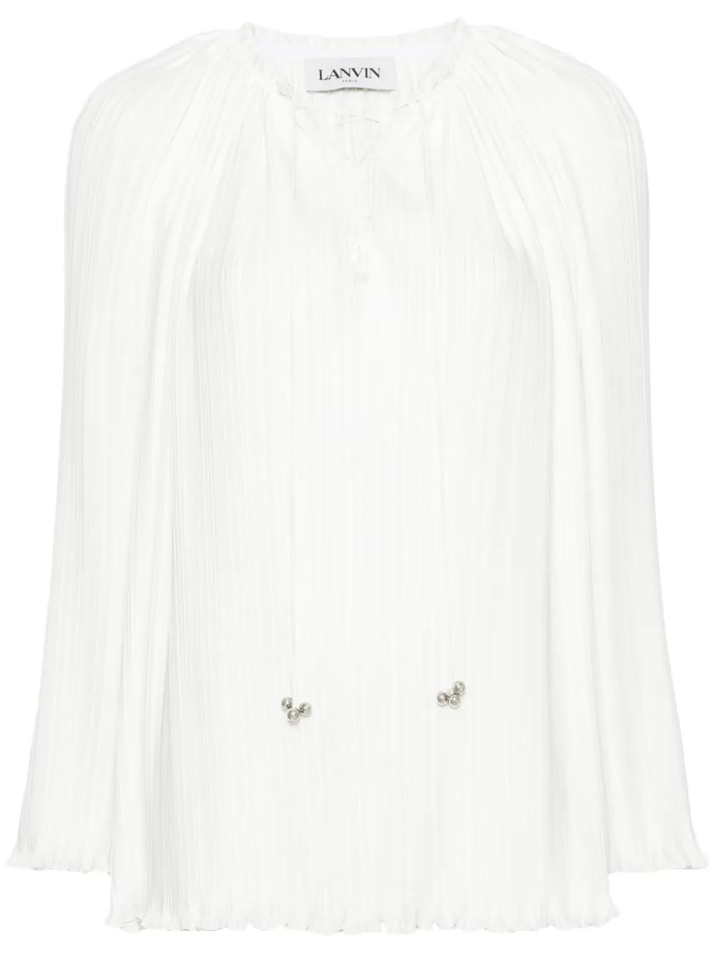off-white plissé effect bead embellishment frilled neckline front lace-up fastening long sleeves lettuce hem silver-tone hardware