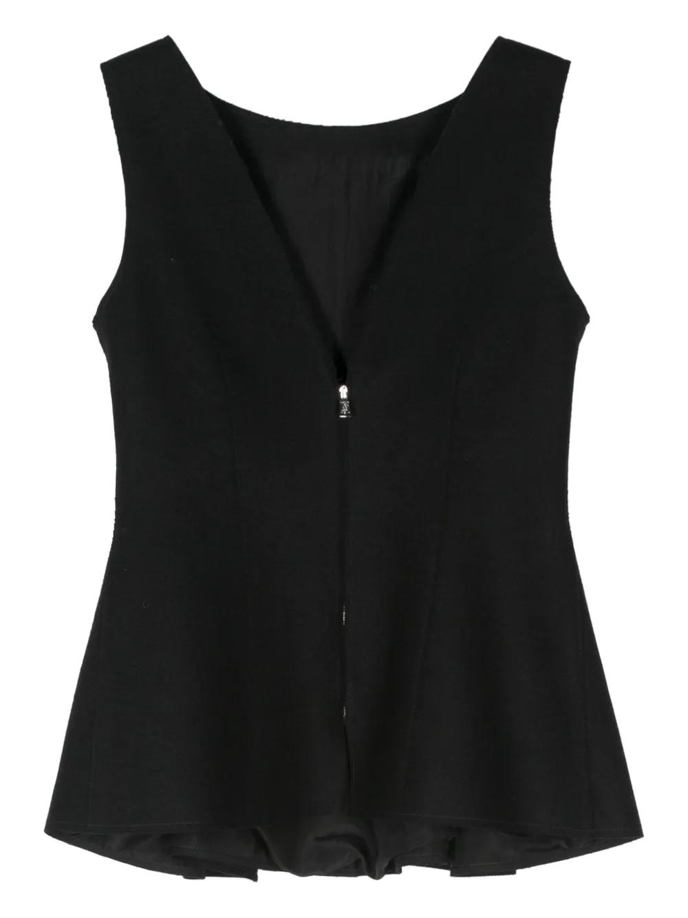 black virgin wool felted finish concealed front zip fastening V-neck sleeveless flared silk lining peplum hem