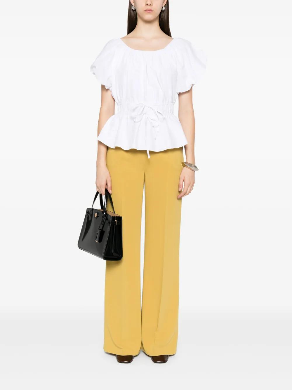 white front touch-strap fastening draped detailing short sleeves curved hem