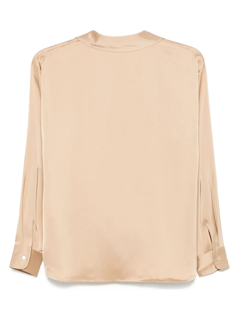 beige recycled polyester blend satin weave wrap design front hook and eye fastening V-neck spread collar long sleeves buttoned cuffs curved hem