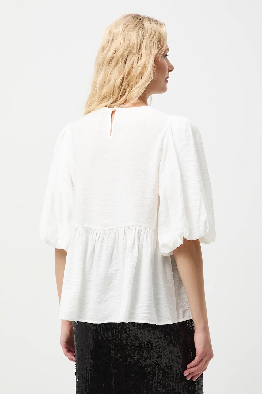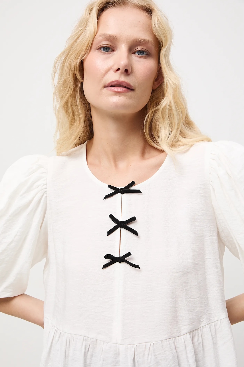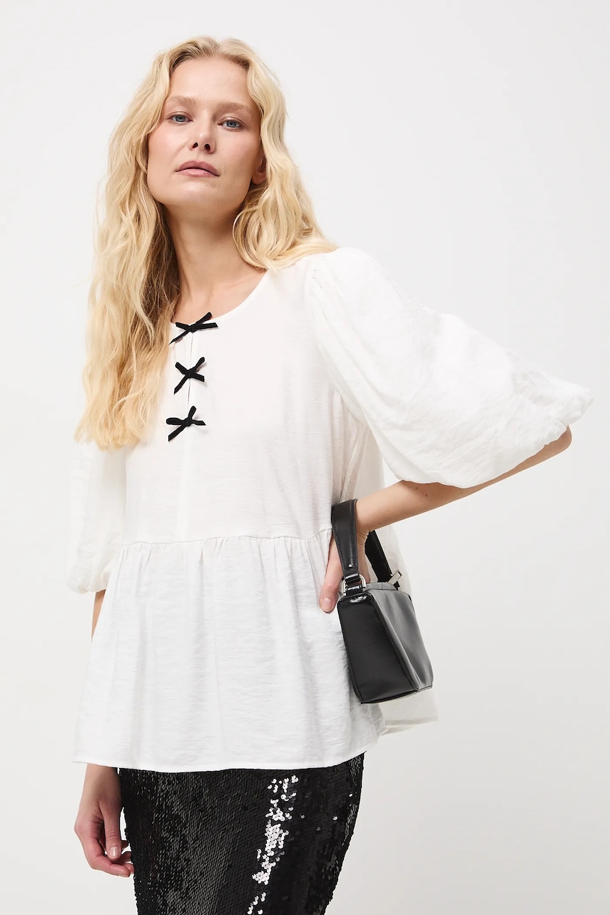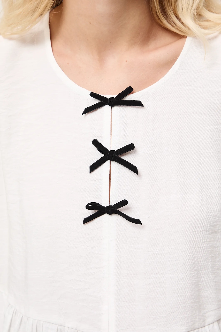 - Fason oversize. - Krótkie, bufiaste rękawy. - Rękawy wykończone elastyczną gumką. - Okrągły dekolt. - Model z ozdobną falbaną. - Ozdobne kokardki. - Tkanina typu slub o nieregularnej teksturze. - Szerokość w biuście: 47 cm. - Długość: 62,5 cm. - Wymiary podane dla rozmiaru: S.
